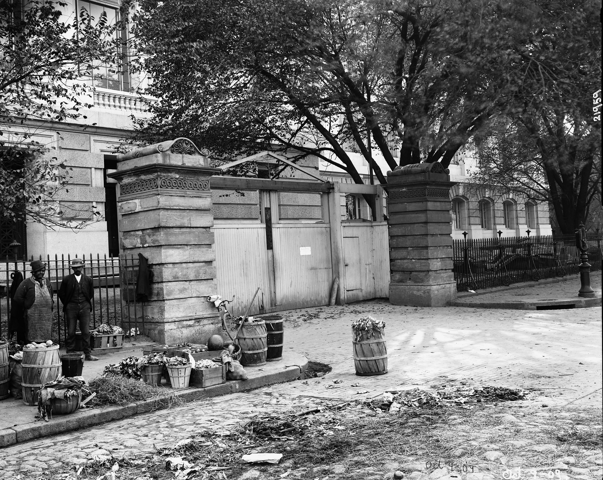 Two African-American Center Market vendors selling produce outside the gate of the National Museum of Natural History on October 9, 1909.