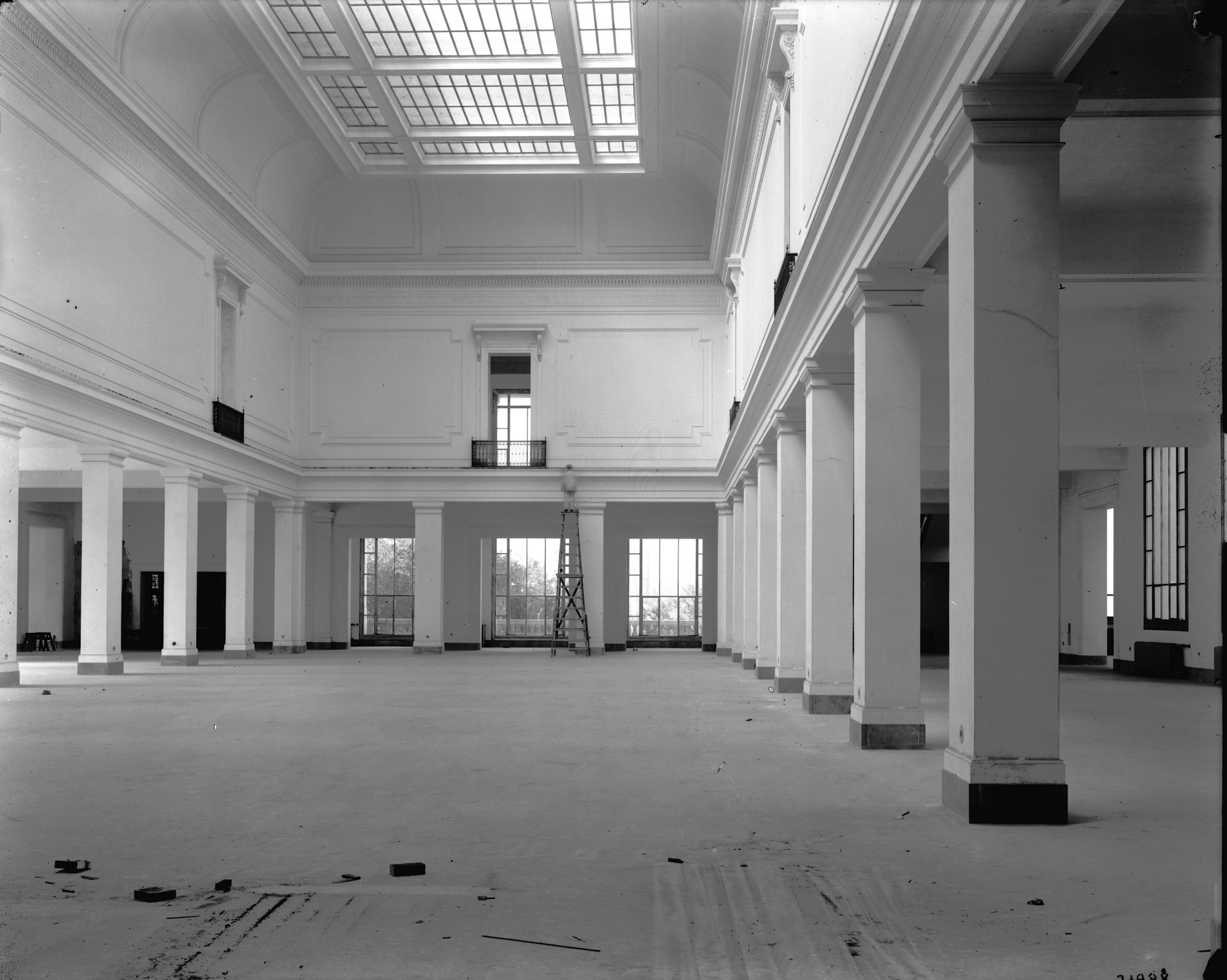 The first floor, north wing, of the National Museum of Natural History with a painter on a ladder. The hall is empty and there are windows to the balcony, and a skylight.