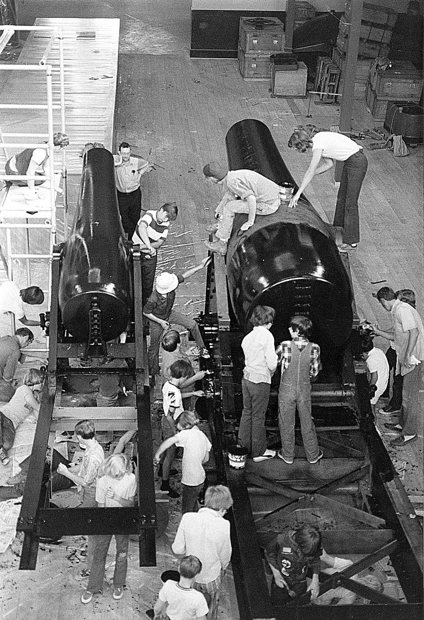 Boy Scouts from Potomac, Maryland, painting Civil War coast defense guns for the '1876: A Centennial Exhibition,' in the Arts & Industries Building.