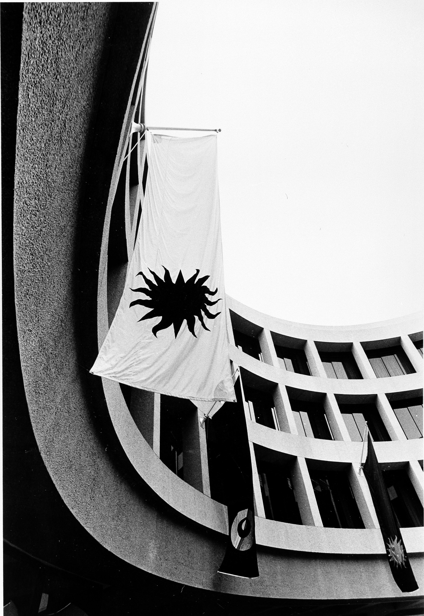 Hirshhorn Museum and Sculpture Garden building, with 22-foot nylon banners, looking up from the fountain plaza in the middle of the building.