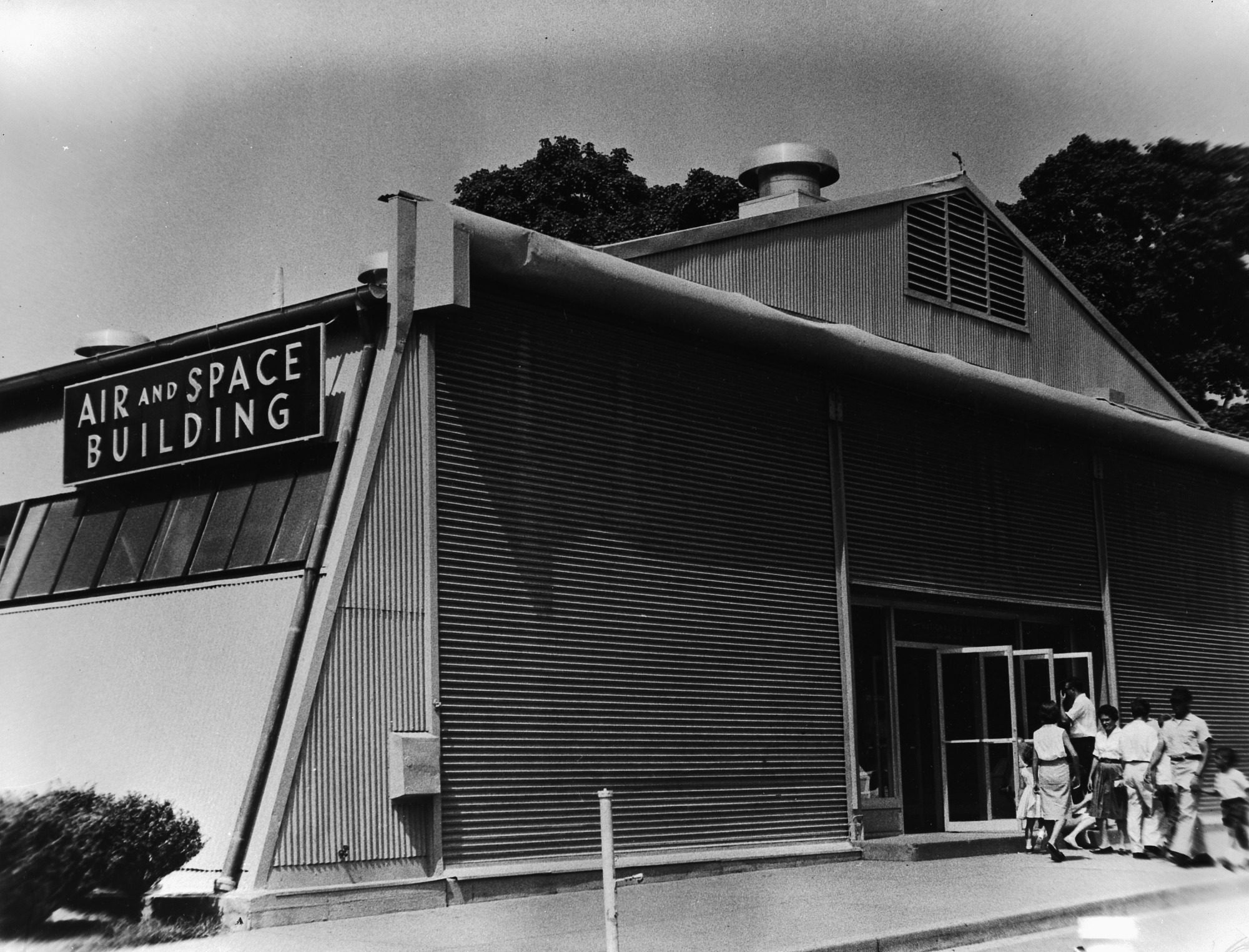 Visitors entering the Air and Space Building in the South Yard. Originally built in 1917 by the U.S. Signal Service for use during World War I, the temporary metal building was transferred to the Smithsonian in 1919 and opened as a museum. It was demolished in 1975 in preparation for the Victorian Garden, the Bicentennial Celebrations, and the new Air and Space Museum.