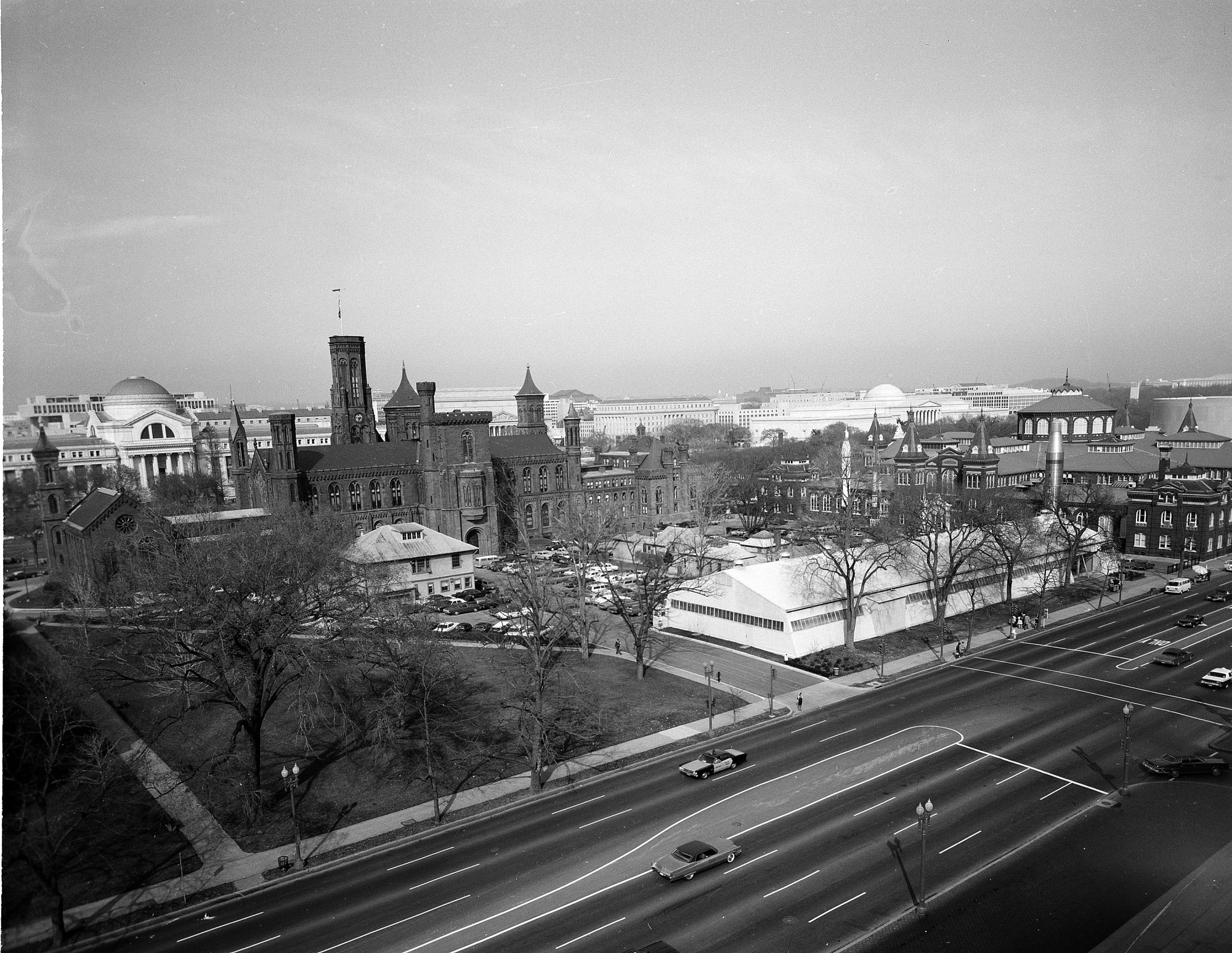 View of the South Yard taken from the roof of Forrestal Building (Department of Energy) shows the skyline of downtown Washington, D.C. Smithsonian buildings visible include the Smithsonian Institution Building (SIB), and the Arts and Industries Building (A&I). In the South Yard are the National Air Museum, "Rocket Row" along the west side of the Arts and Industries Building, the South Shed, and various other sheds. The National Gallery of Art west building is also visible in the background. The new circular Hirshhorn Museum can be seen behind the A&I Building.