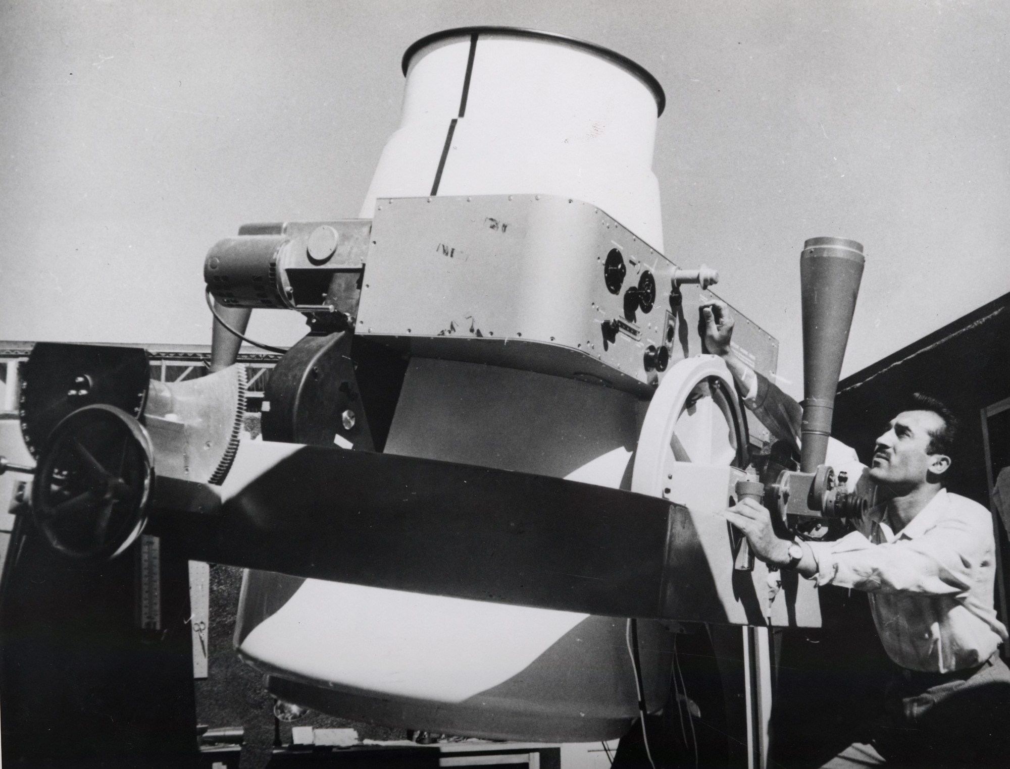 An observer and a Baker-Nunn camera maintained by the Smithsonian Astrophysical Observatory field station at Naini Tal, India, for the photographic observation of celestial objects in space.