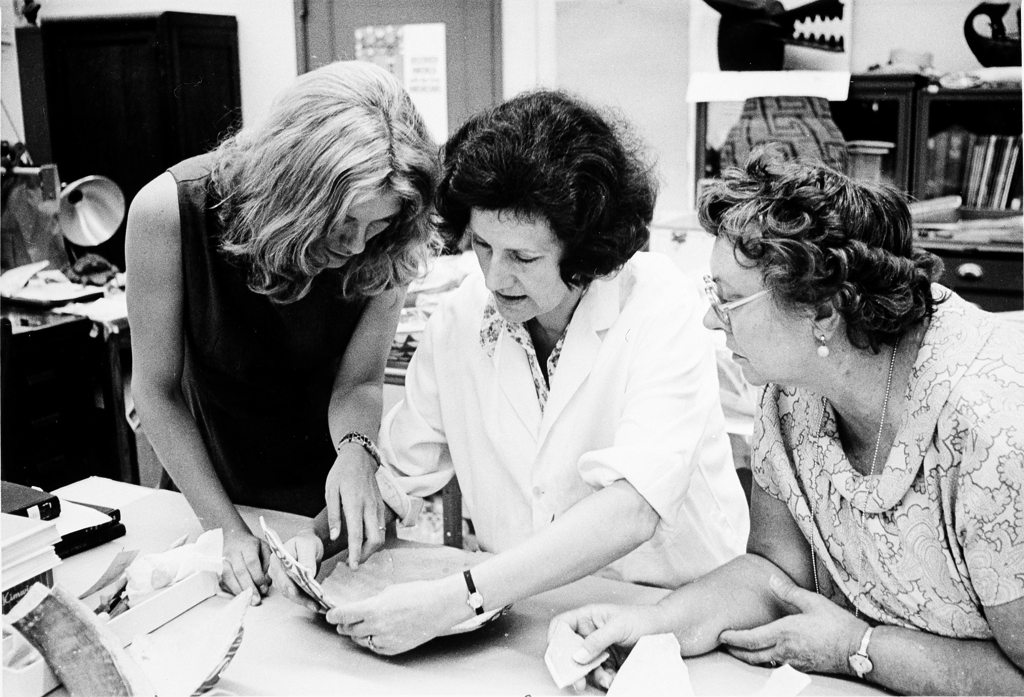 National Museum of Natural History's Anthropology Conservation Laboratory's Supervisor Bethune Gibson (center) with Conservator Carolyn Rose (left) and volunteer Edith Deitz (right) looking at an artifact in the laboratory.