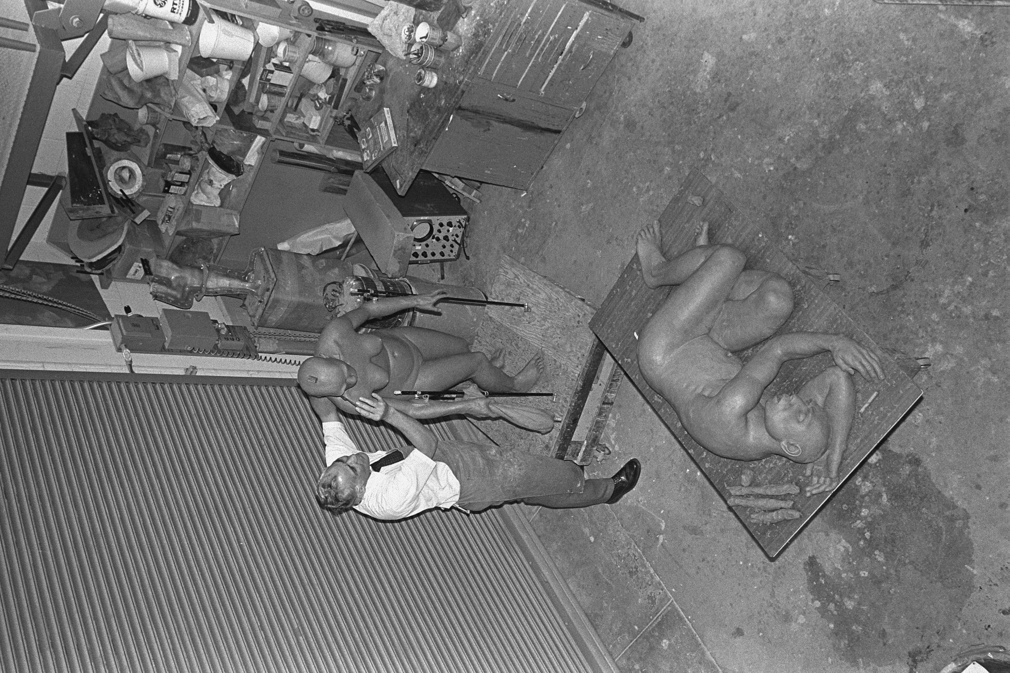 Vernon Rickman, a technician in the models and plastics shop of the Exhibit Central Office, working on group of Neanderthal people for the National Museum of Natural History exhibit "Ice Age Mammals and the Emergence of Man."