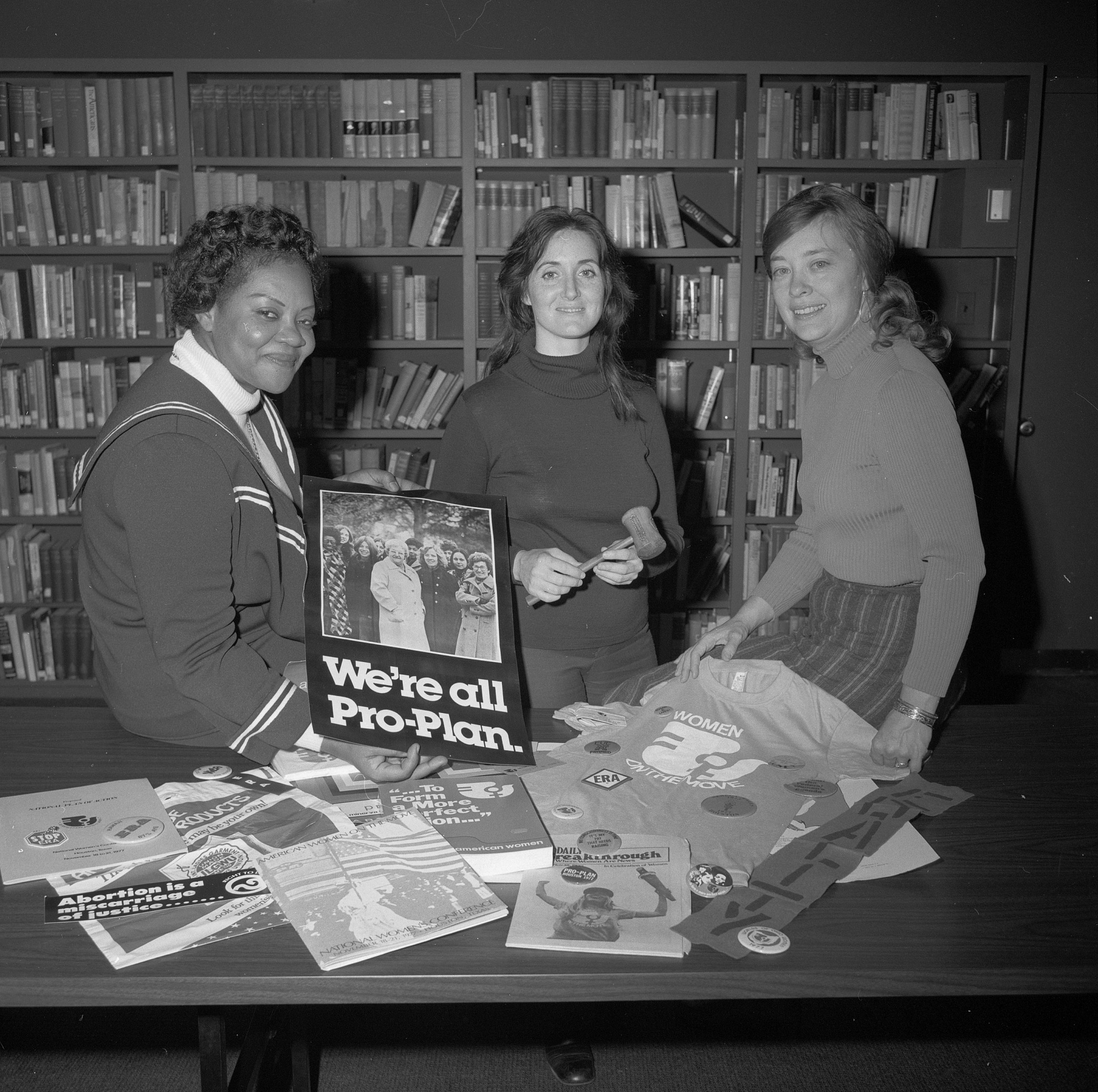 LaVerne Love, Office of Equal Opportunity (OEO), Dianne Walker (Computer Services and former chair of the Women's Committee) and Curator Edith Mayo, National Museum of History and Technology (NMHT) display some of the memorabilia collected at the National Women's Conference held in Houston, Texas in November 1977.