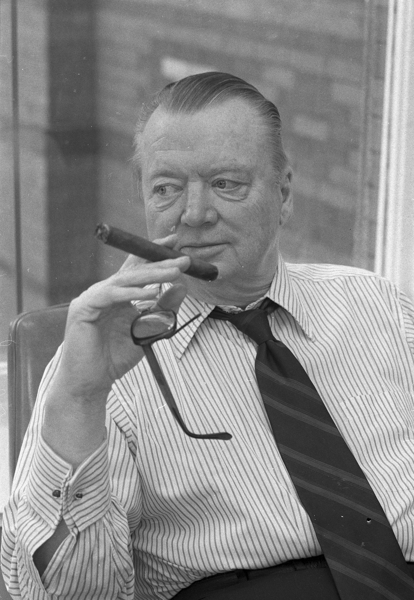 Edward K. Thompson, editor, Smithsonian Magazine, c.1970-1979. Photo taken December 1977. In this photograph Thompson is holding a cigar and dangling his glasses in his right hand, as he looks off to the side.