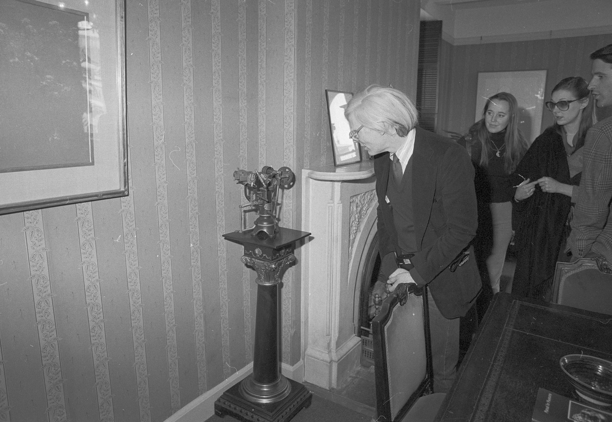 Artist Andy Warhol touring the Smithsonian Institution Building (SIB) to view the Castle Collection. In this photograph Warhol is seen inspecting a shoemaking machine patent mode, set atop a pedestal, in the office of Assistant Secretary for History and Art Charles Blitzer, 14 February 1977.
