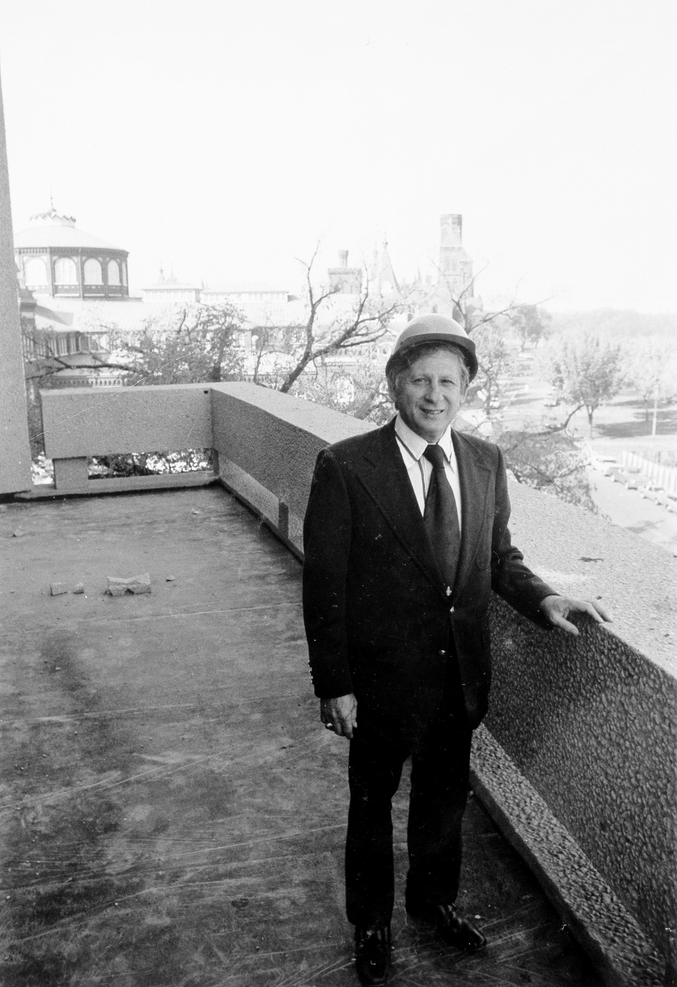 Joseph Sekefar, Administrator at Hirshhorn Museum and Sculpture Garden, shown atop unfinished Hirshhorn Museum. The roof of the Arts and Industries Building and the towers of the Smithsonian Institution Building can be seen in the background.