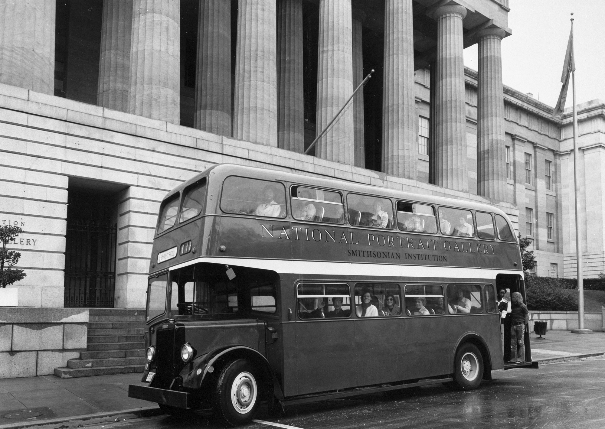 The National Portrait Gallery's free double decker shuttle bus took visitors between the National Museum of History and Technology, now the National Museum of American History, and the National Portrait Gallery in the old Patent Office Building. The attendant on board the bus presented passengers with an introductory talk about the Gallery, its collections and special exhibitions.