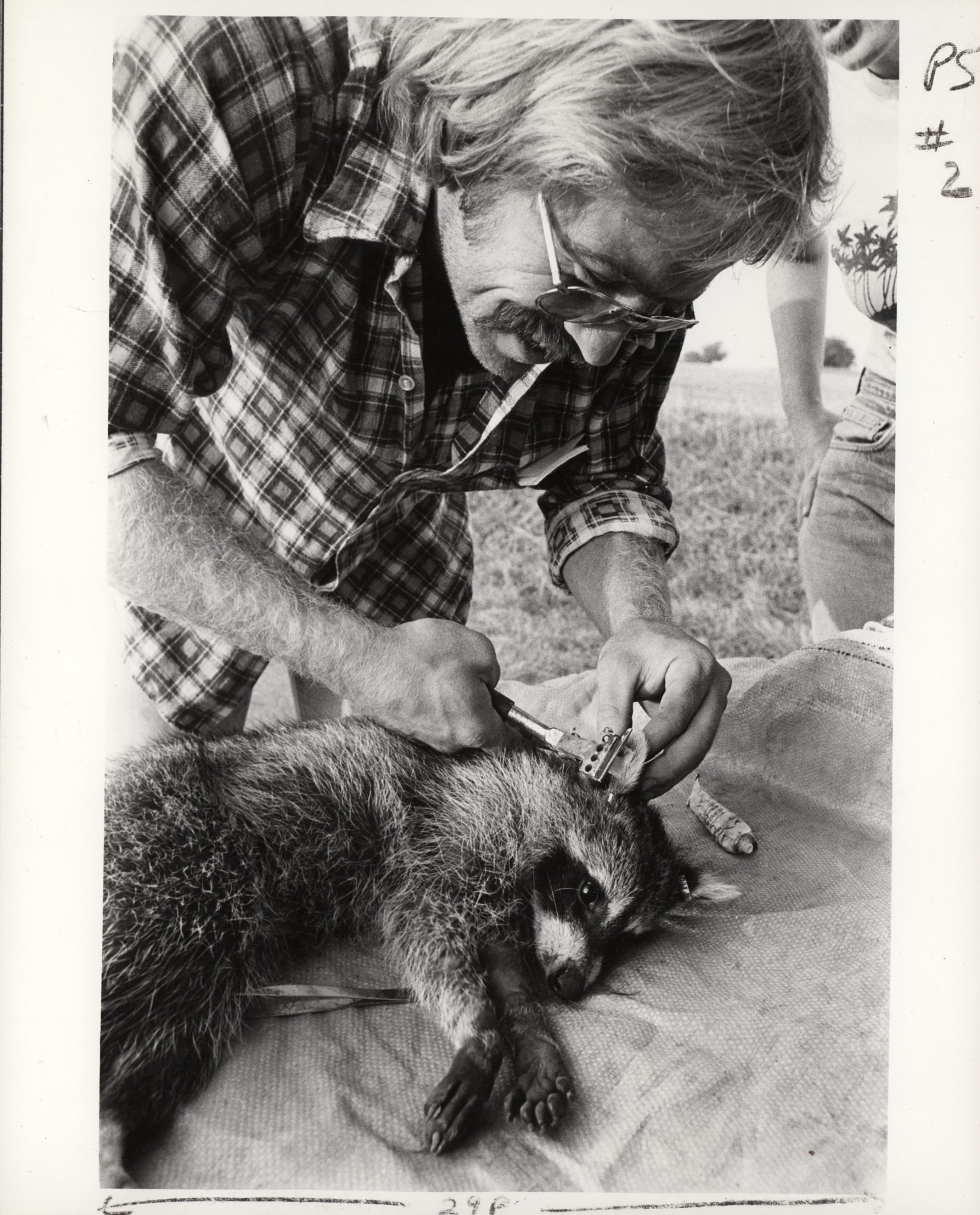 Conservation and Research Center's Greg Sanders places an ear tag on a raccoon, one of more than 200 animals tracked and studied by CRC, part of the National Zoological Park.