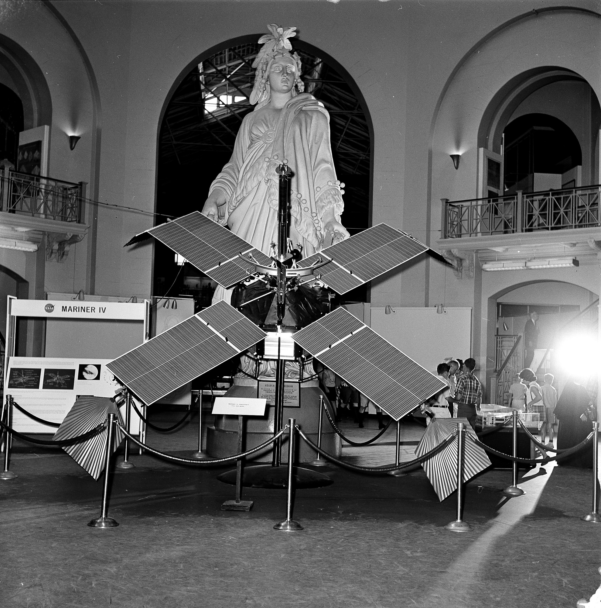 Full-sized model of the Mariner IV Satellite on exhibit in the rotunda of the Arts and Industries Building in front of the "Statue of Freedom." The model is part of a National Air Museum exhibit in the Arts & Industries Building.