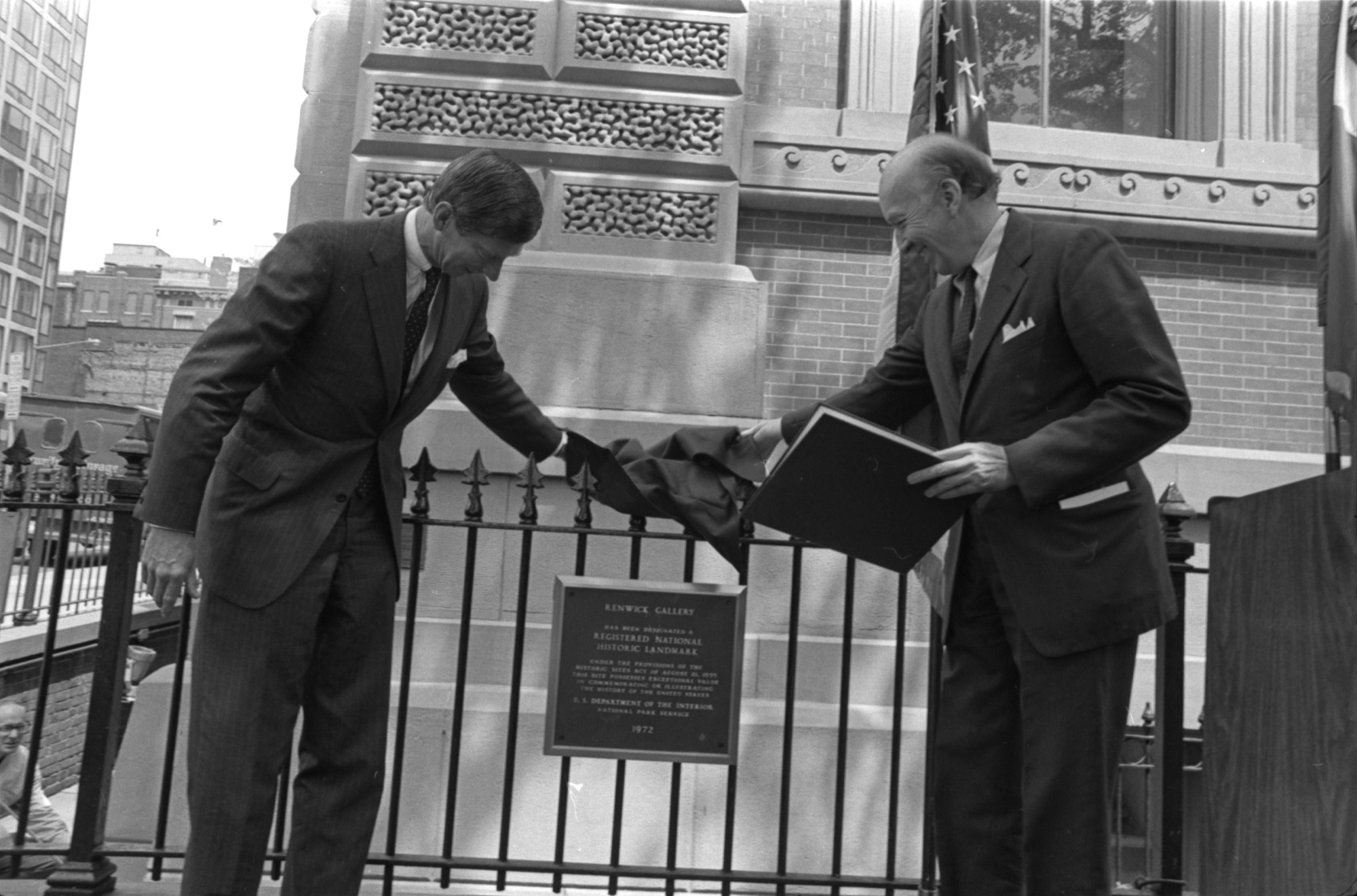 Eighth Smithsonian Secretary S. Dillon Ripley and Nathaniel P. Reed, Assistant Secretary of the Interior, unveiling a plaque designating the Renwick Gallery a National Historic Landmark, May 4, 1973.