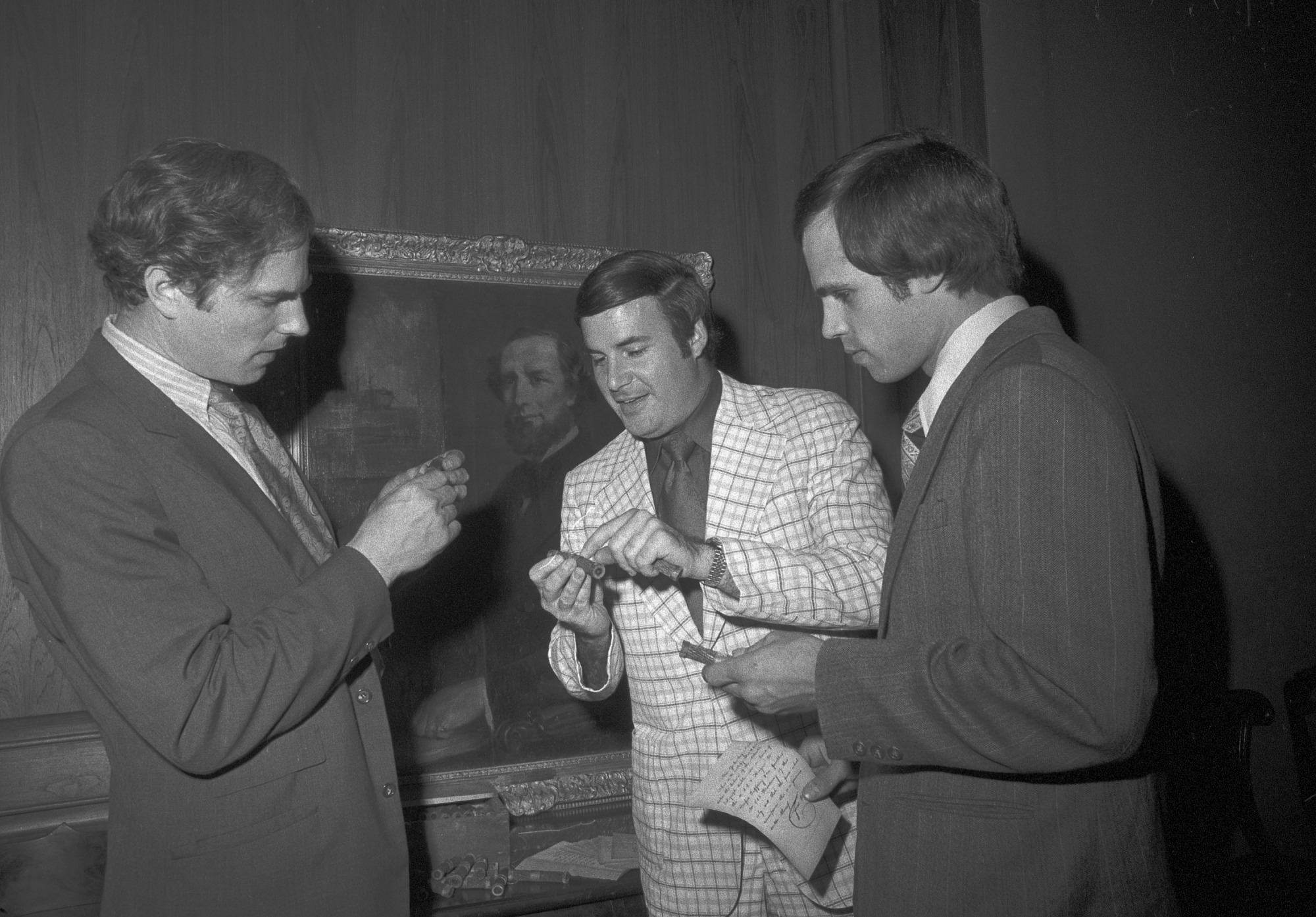 Bernard Finn, curator in Division of Electricity & Nuclear Energy (NMHT), Richard Moskow (Silver Creations, Ltd.) and Randall King (Lanello Reserves, Inc.) examine a section of the 1858 Atlantic cable.