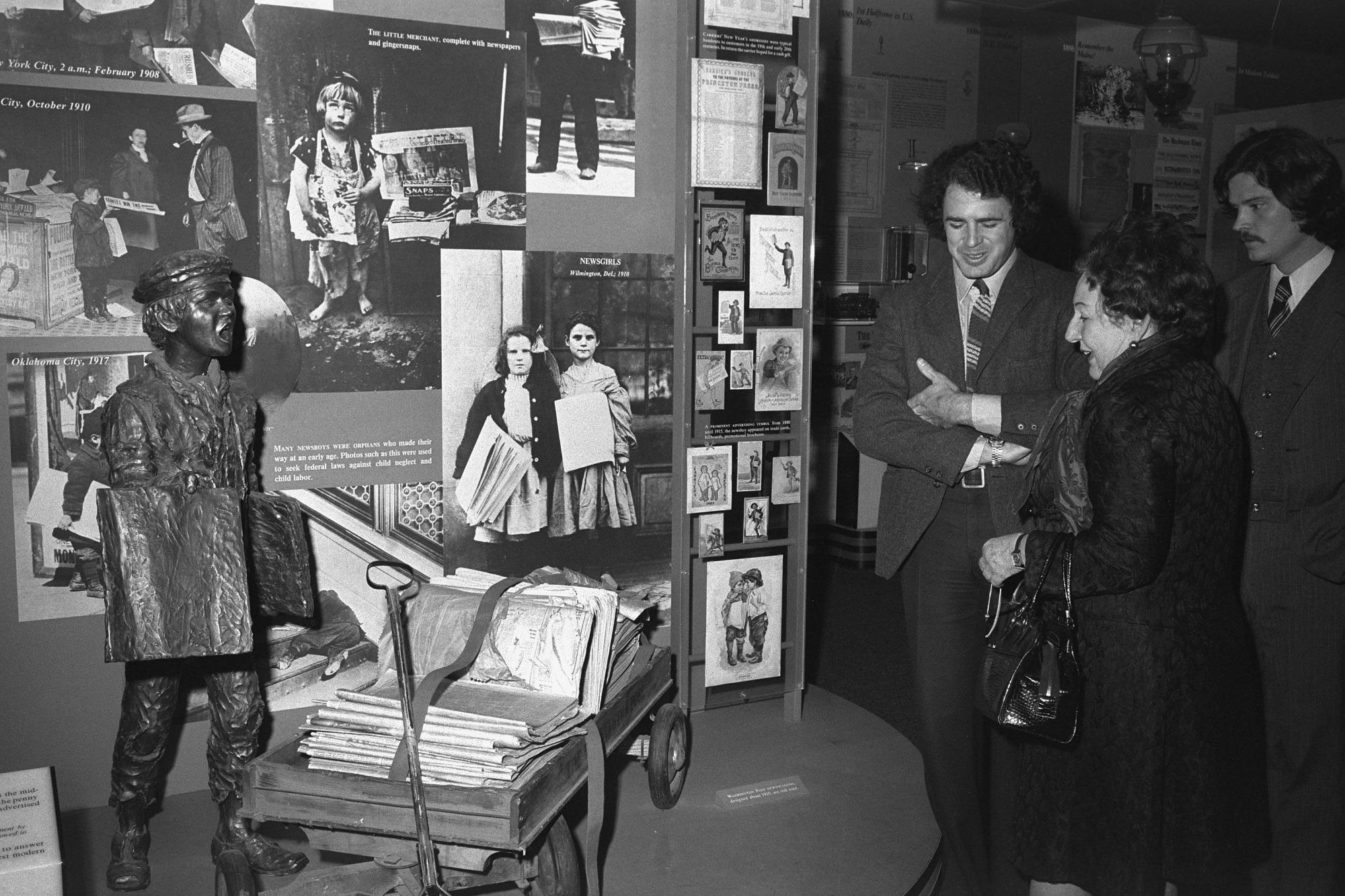 Sarah McClendon touring the Hall of News Reporting, National Museum of History and Technology, now the National Museum of American History, with Peter Marzio, Associate Curator of the Division of Graphic Arts, and Robert S. Harding of the Division of Public Information and Education on October 3, 1974.