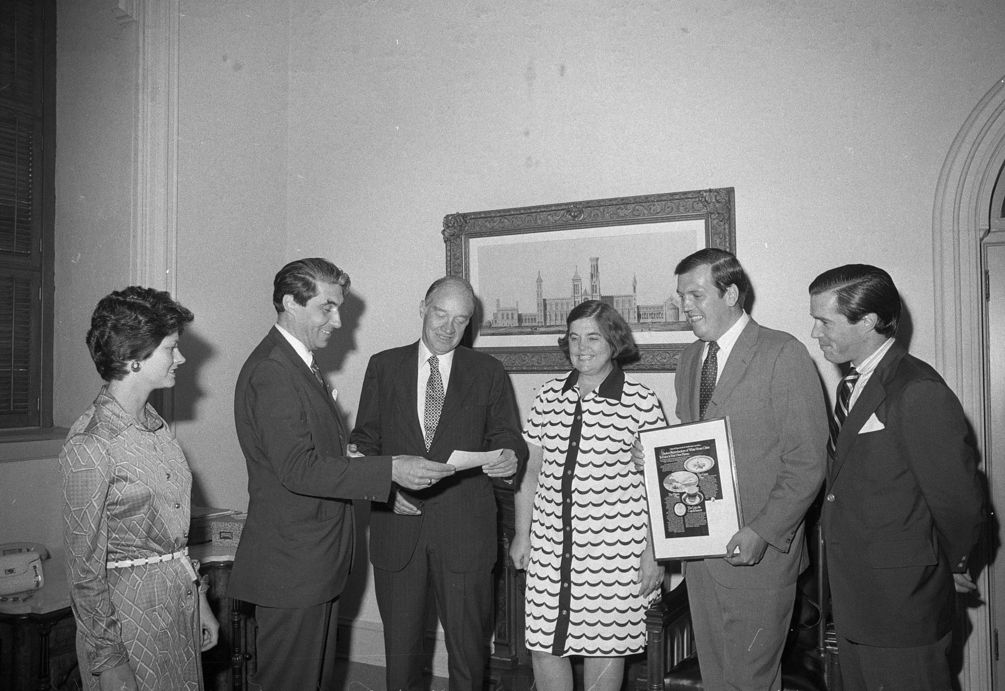 T. Ames Wheeler presenting Paul N. Perrot with check to be used for a SITES exhibit on Presidential china, with Anne Gossett, Margaret Klapthor, Richard Griesel, James Lyons, 3 September 1975.