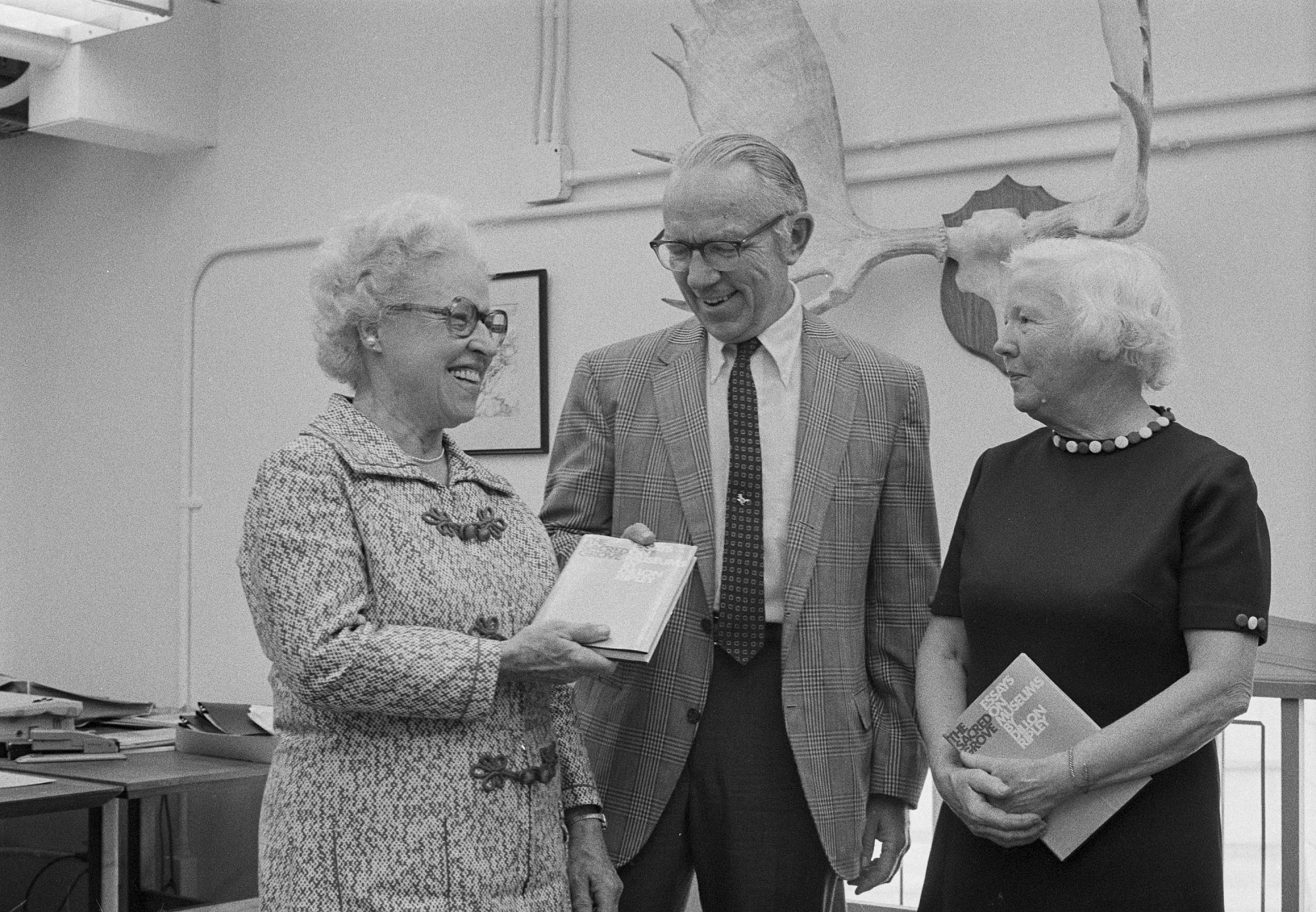Edward Rivinus, director of SI Press, with SI Press volunteer team Jennie Clyde Hollis and Roberta Downes, better known as 'Bonnie and Clyde.' The women are holding copies of "The Sacred Grove: Essays on Museums by Dillon Ripley."