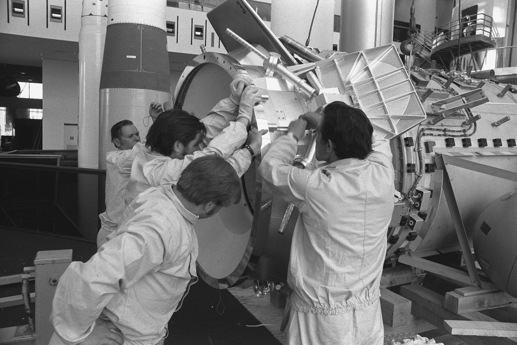 At the National Air and Space Museum, Russian specialists assemble a Soviet docking system to Apollo docking module, May 22, 1976. This is during the installation of exhibition before the museum opens to the public.