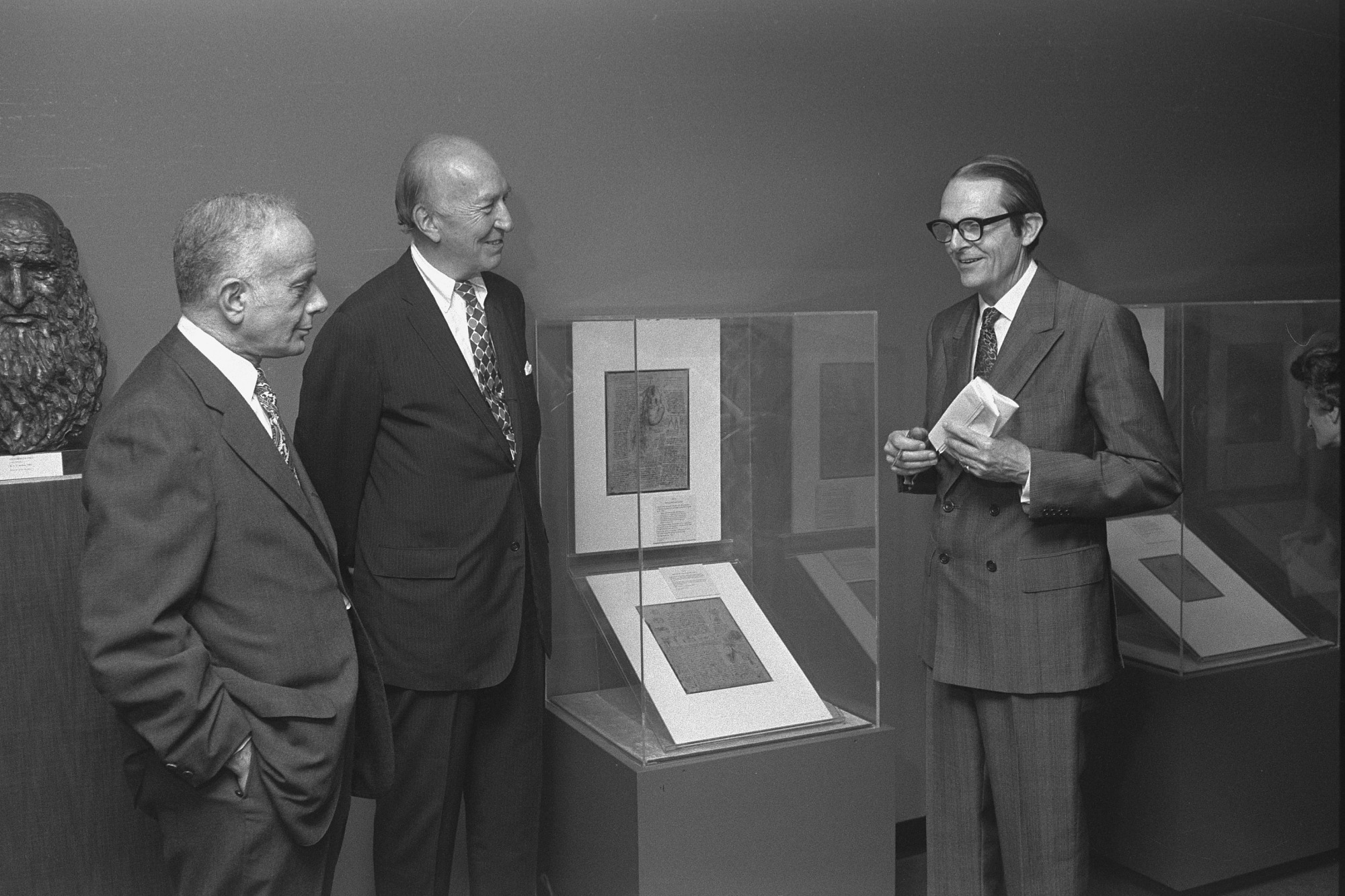 National Museum of History and Technology (NMHT), now the National Museum of American History, Deputy Director Silvio A. Bedini (1972-1978), Secretary S. Dillon Ripley (1964-1984) and Sir Robin Mackworth-Young, Royal Librarian from Windsor, with drawing from the exhibition "Leonardo da Vinci's Anatomical Drawings from the Queen's Collection at Windsor Castle," at the National Museum of History and Technology. The exhibition opened July 1,1976.
