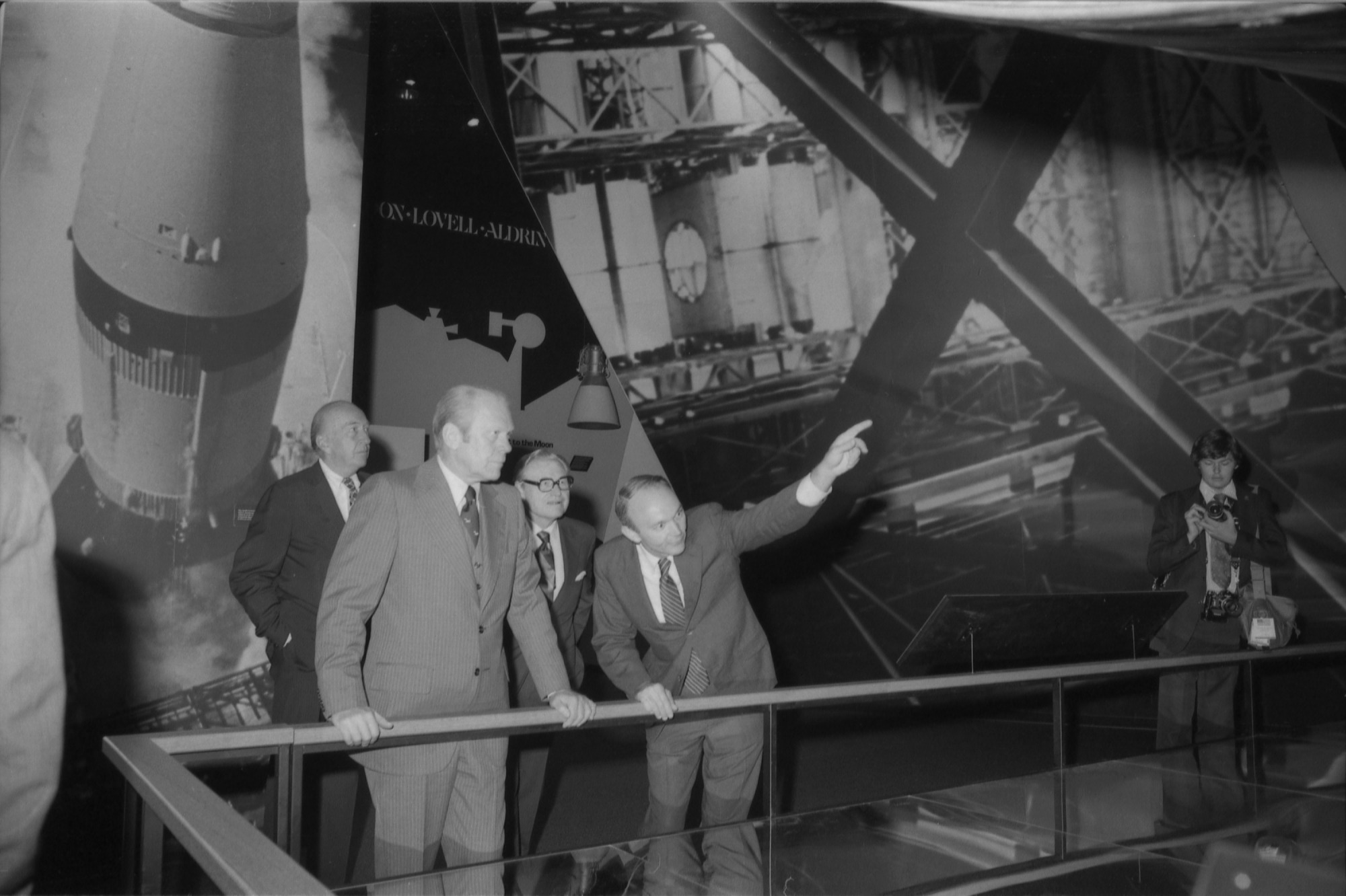 President Gerald Ford, Michael Collins, Director of the National Air and Space Museum and former astronaut, with Secretary S. Dillon Ripley and Vice President Nelson Rockefeller, touring the "Apollo to the Moon Gallery" on opening day of the new building, July 1, 1976.