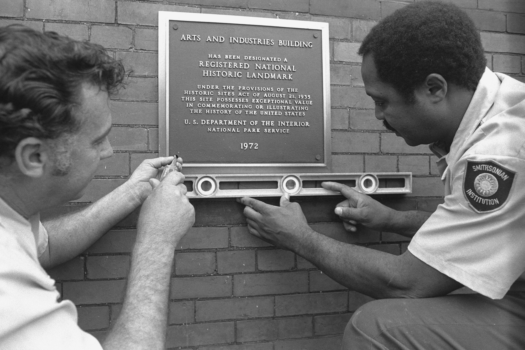 Joseph Forrest (l.) and Eldrey Bell of the Craft Services Division affix the National Historic Landmarks' plaque to the Arts and Industries Building at the west entrance