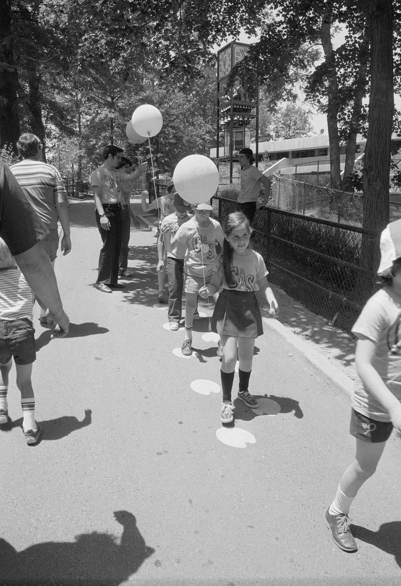 Balloon-toting young visitors following the National Zoological Park's new Zebra Trail, 30 June 1977.