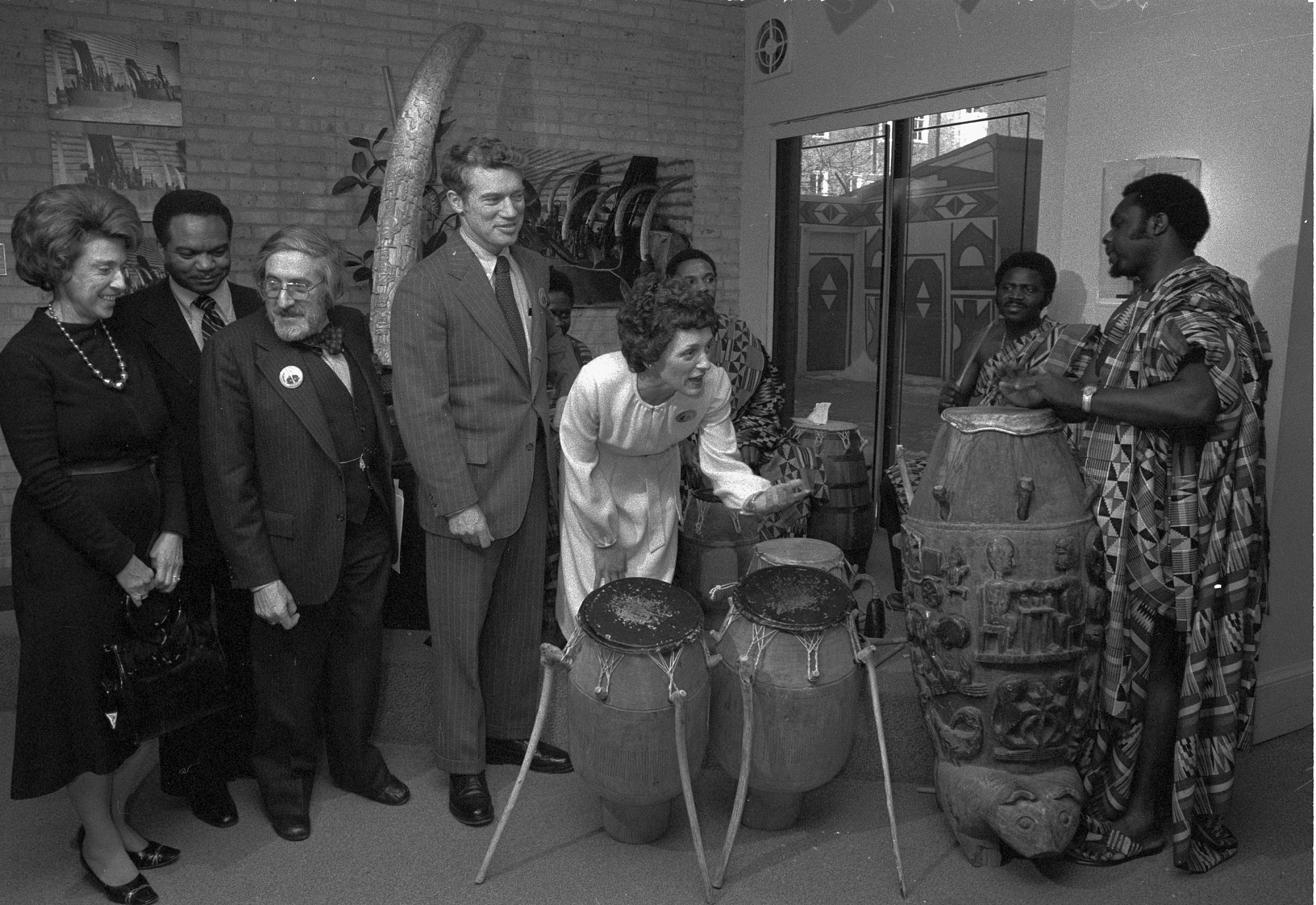 Mrs. Walter [Joan] Mondale playing the drums after a press conference at the National Museum of African Art (NMAfA) with, (l-r), Rep. Lindy Boggs, Rep. Walter E. Fauntroy, Warren Robbins (founder of the Museum) and Sen. Wendell Anderson.