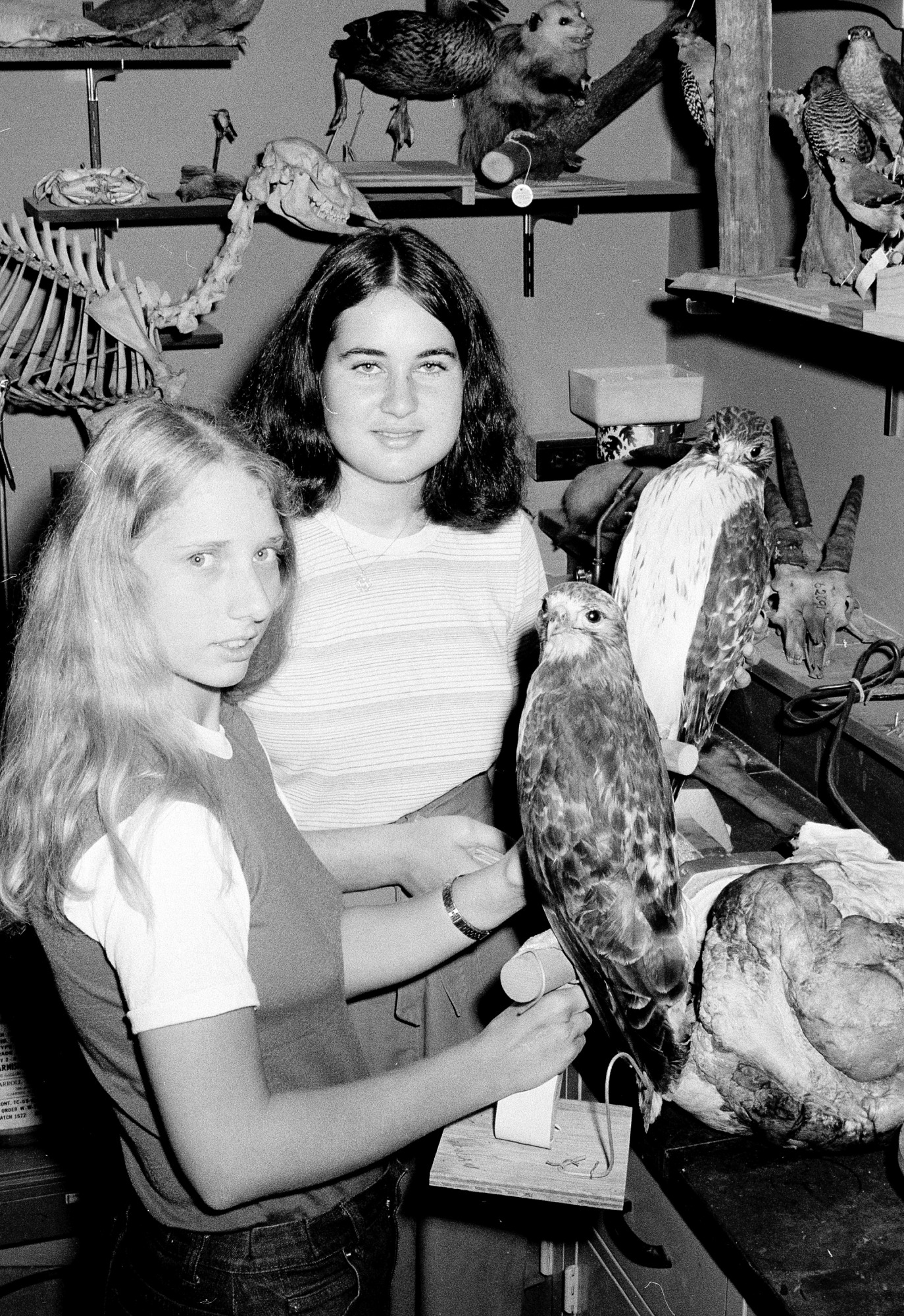 Office of Elementary and Secondary Education interns Lisa Schwartz (left) and Ann Downer, in the National Museum of Natural History freeze-dry lab holding birds. They are two of 35 high school seniors in the summer work intern program.