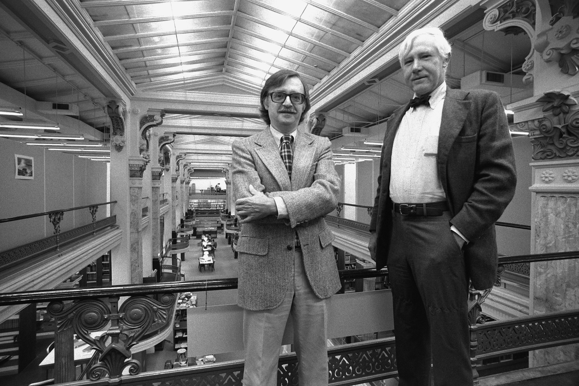 Deputy Director Garnett McCoy (r.) and curator Arthur Breton on the balcony of the old Patent Office Building, the Archives of American Art headquarters. A bureau of the Smithsonian, the Archives exists to assist writers, scholars and researchers by assembling and preserving the records of the nation's artists, dealers, critics, galleries and museums.