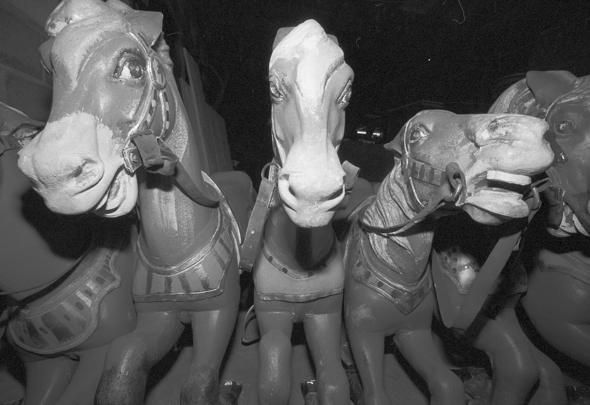 A close up of the horses from the Baltimore's Gwynn Oak Park carousel which replaced the old Smithsonian carousel on the Mall in April 1981. The horses were built by the Allan Herschell Company of New York in 1947.