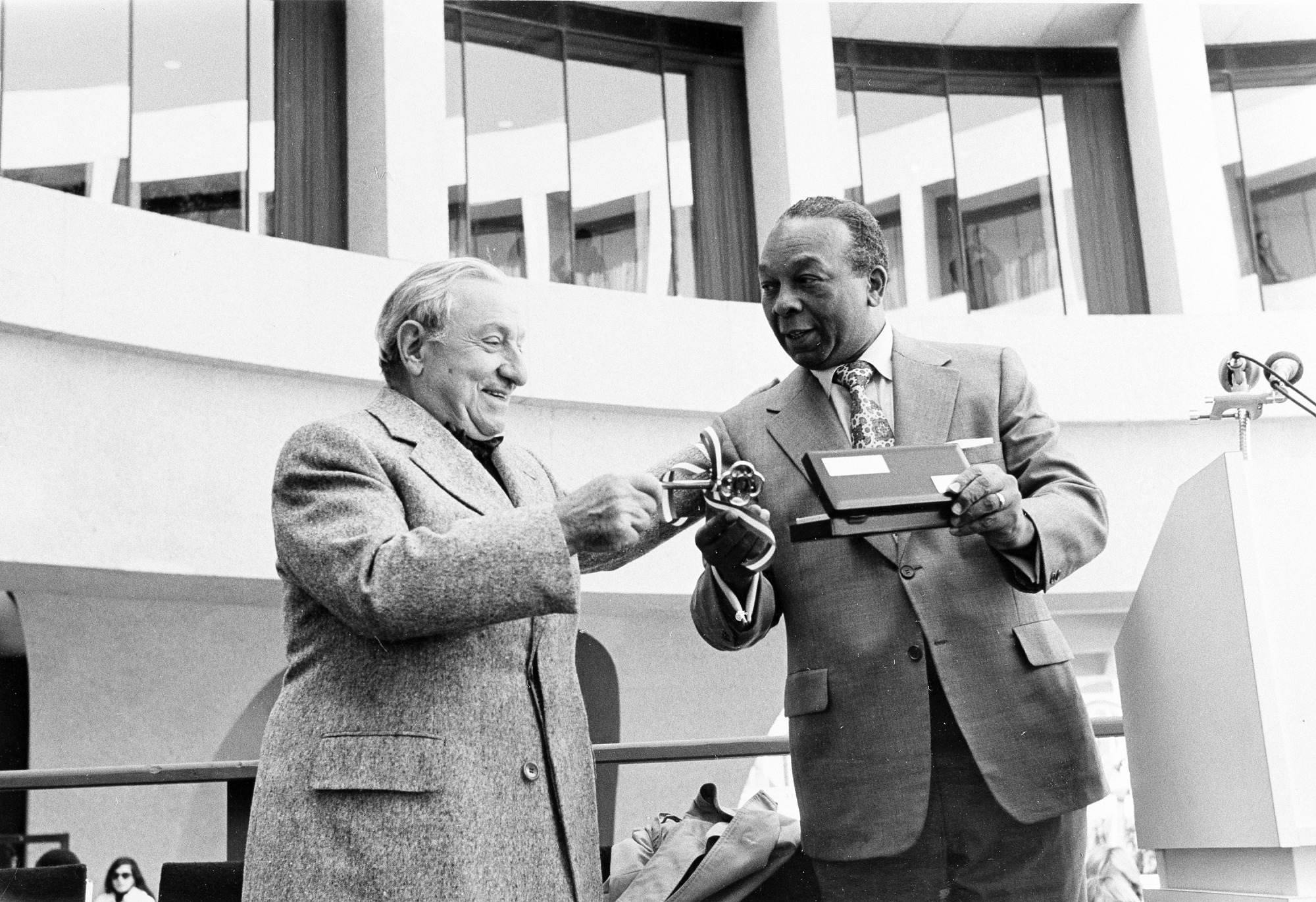 Mayor Walter Washington presents Joseph Hirshhorn with the key to city on the opening day of the Hirshhorn Museum and Sculpture Garden, October 4, 1974.