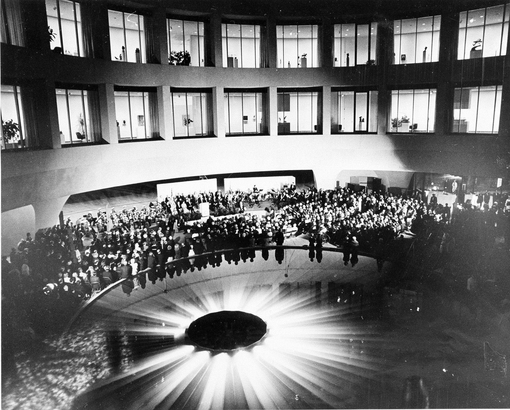 On opening night of the Hirshhorn Museum and Sculpture Garden, October 4, 1974, a crowd has gathered in the interior court.