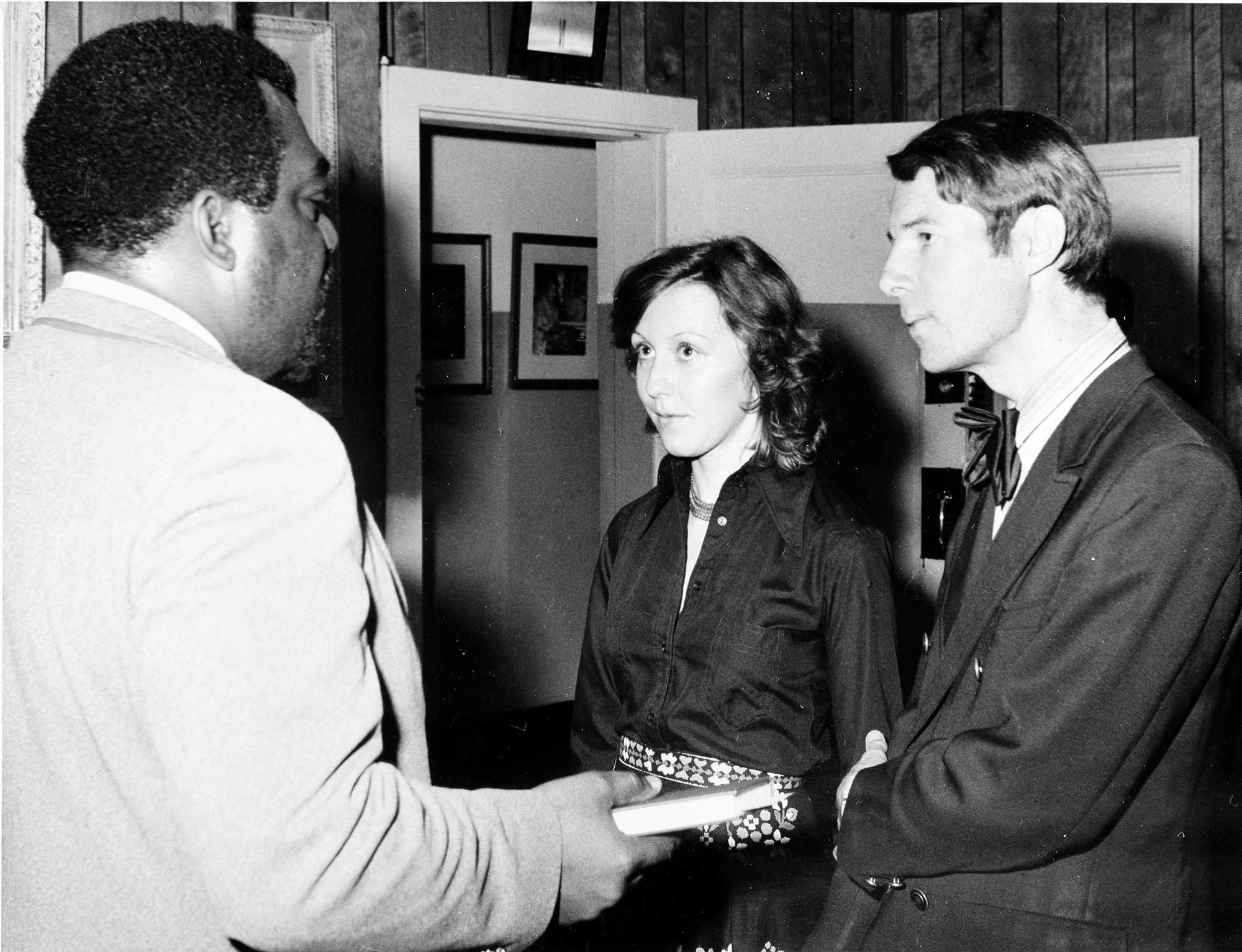John R. Kinard (Director, Anacostia Neighborhood Museum, 1967-1989) performing a wedding ceremony for ANM photographer Michael F. Fischer and Evelyne Oettli. The ceremony took place in Kinard's office, November 19, 1974.