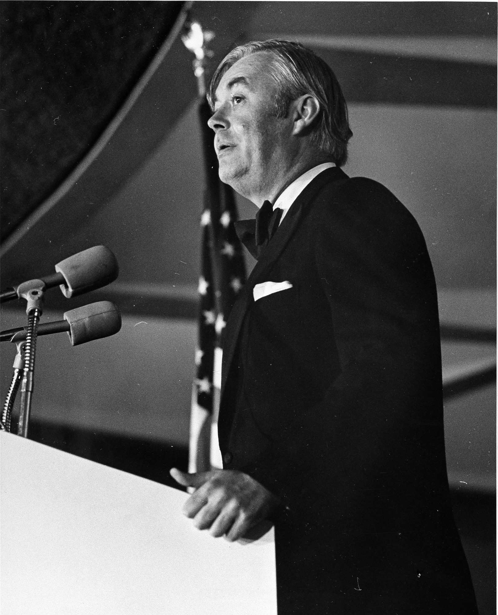 Daniel Patrick Moynihan addressing the crowd on opening night at the Hirshhorn Museum and Sculpture Garden (HMSG).