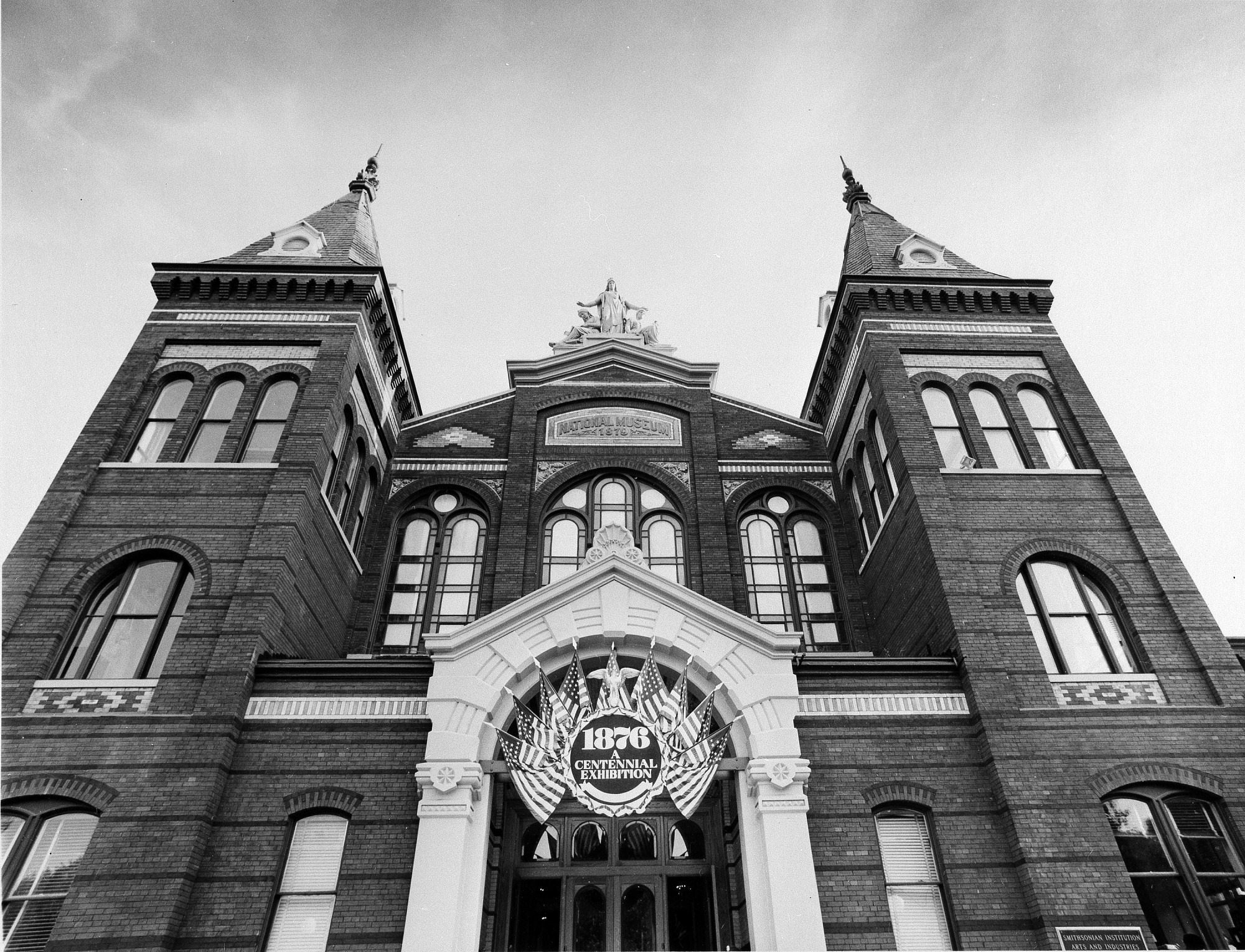 North entrance of Arts and Industries Building with "1876: A Centennial Exhibition" banner above doorway. The exhibit reproduced many displays from the Centennial Exposition in Philadelphia of 1876.