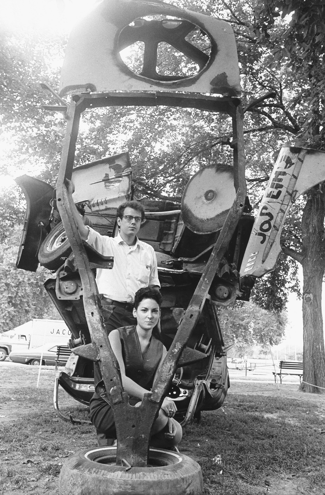 Junked car sculpture for the Department of Transportation "Cars of America--Tomorrow" exhibition on the Mall was actually a car of yesterday, and is now a work of art. Smithsonian sculptors James Fisher (Mechanical & Civil Engineering) and Ann Rushforth (Office of Public Affairs) pose with the untitled figure they created from parts of a wrecked car.