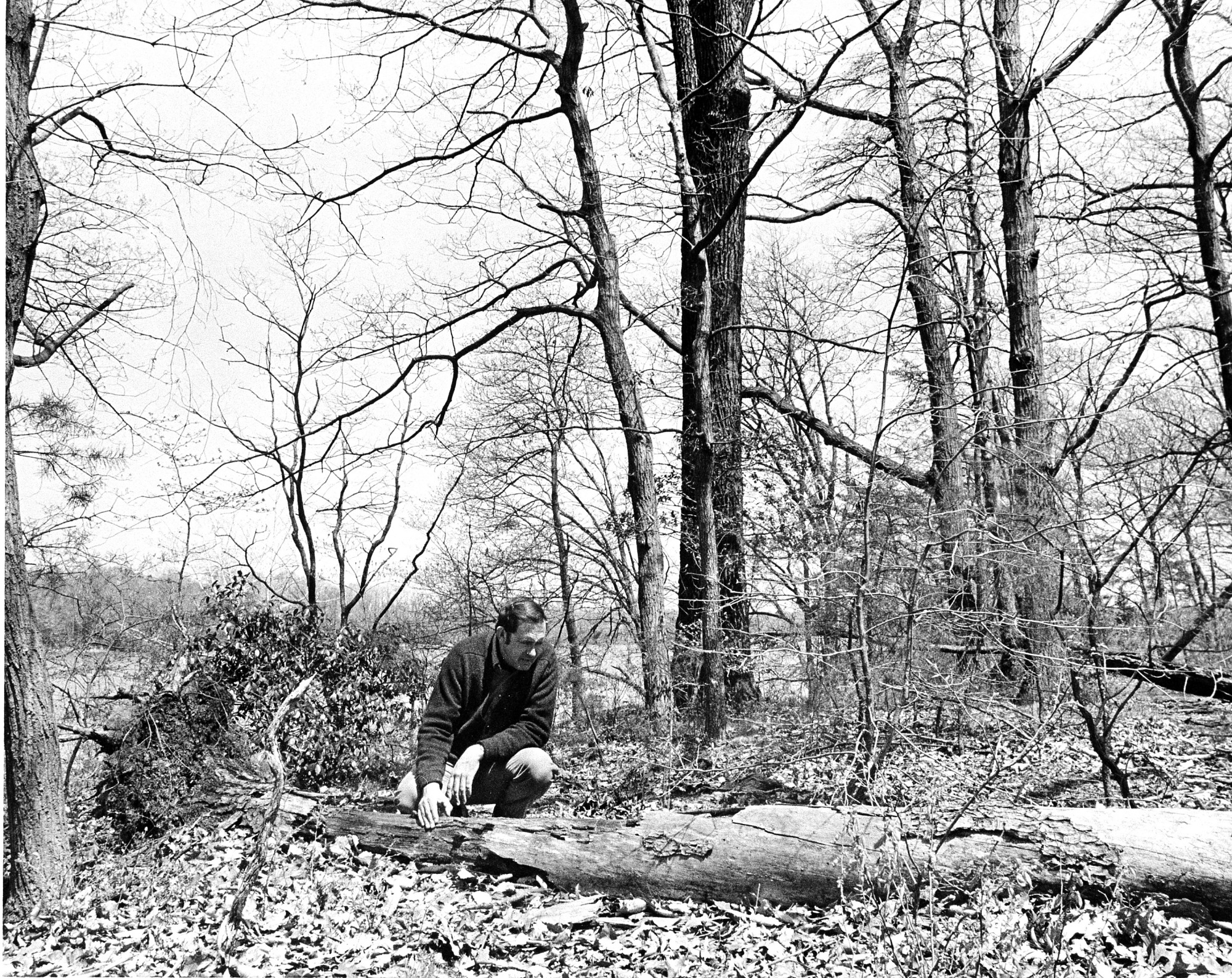 Dr. Francis S. L. Williamson, Director of the Chesapeake Bay Center for Environmental Studies, 1968-1975. Williamson is kneeling next to a fallen tree in the woods.