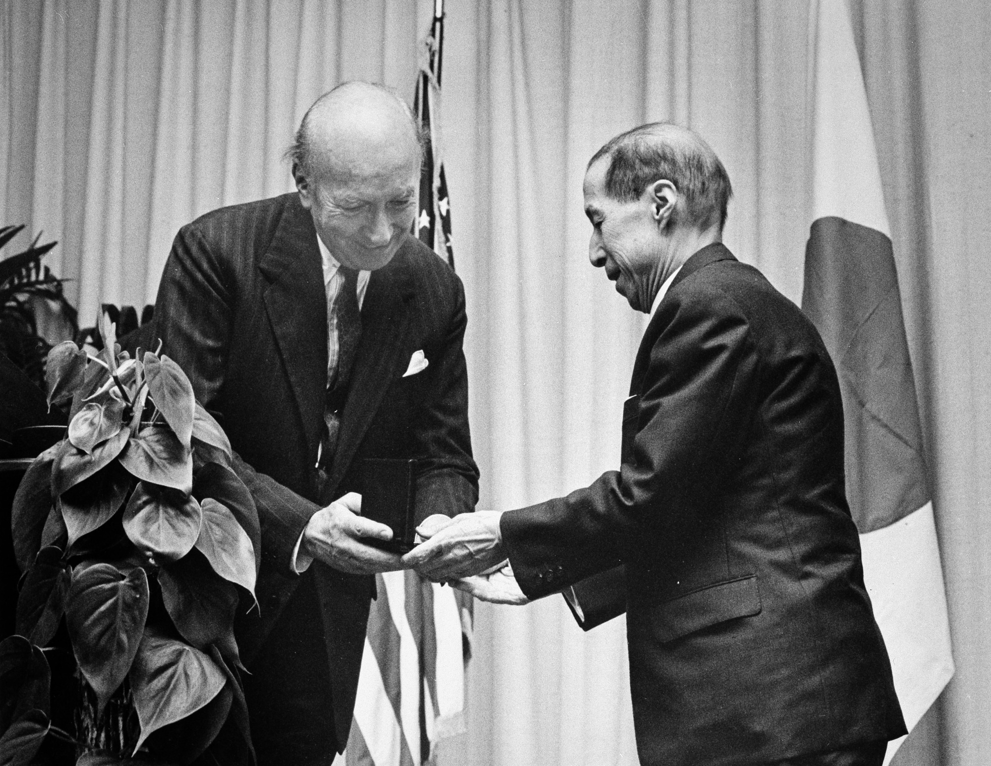 Eighth Secretary (1964-1984) S. Dillon Ripley (1913-2001) presents the Freer Medal "For distinguished contribution to the knowledge and understanding of Oriental civilizations as reflected in their arts" to Professor Tanaka Ichimatsu of Tokyo, Japan, in recognition of his valuable contributions to the study and protection of Japanese art and that nation's cultural heritage, at a ceremony in the auditorium of Freer Gallery of Art, May 2, 1973.