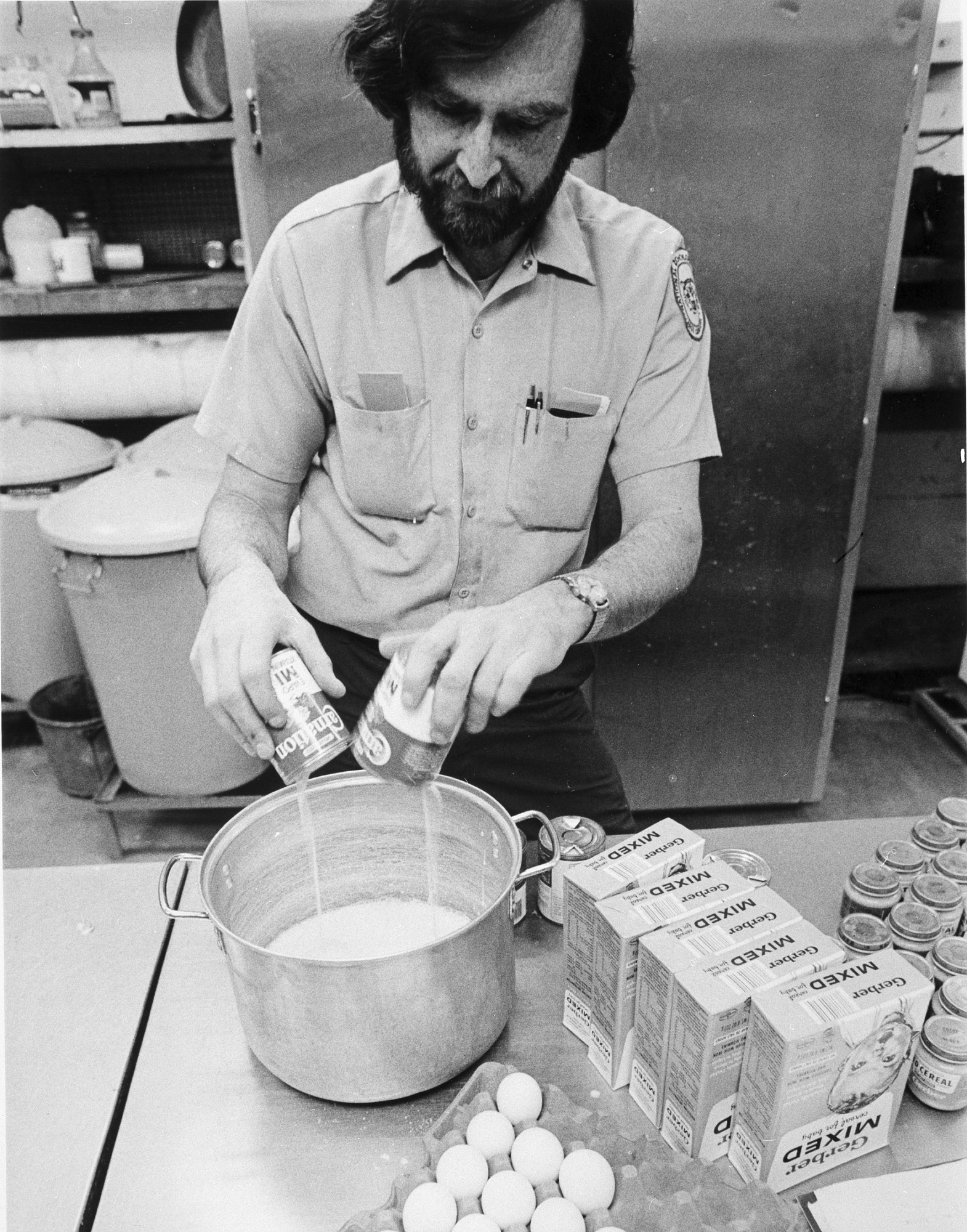 National Zoological Park animal keeper Grayson Harding preparing a meal for residents of the small mammal house in the Zoo's commissary, February 1978.