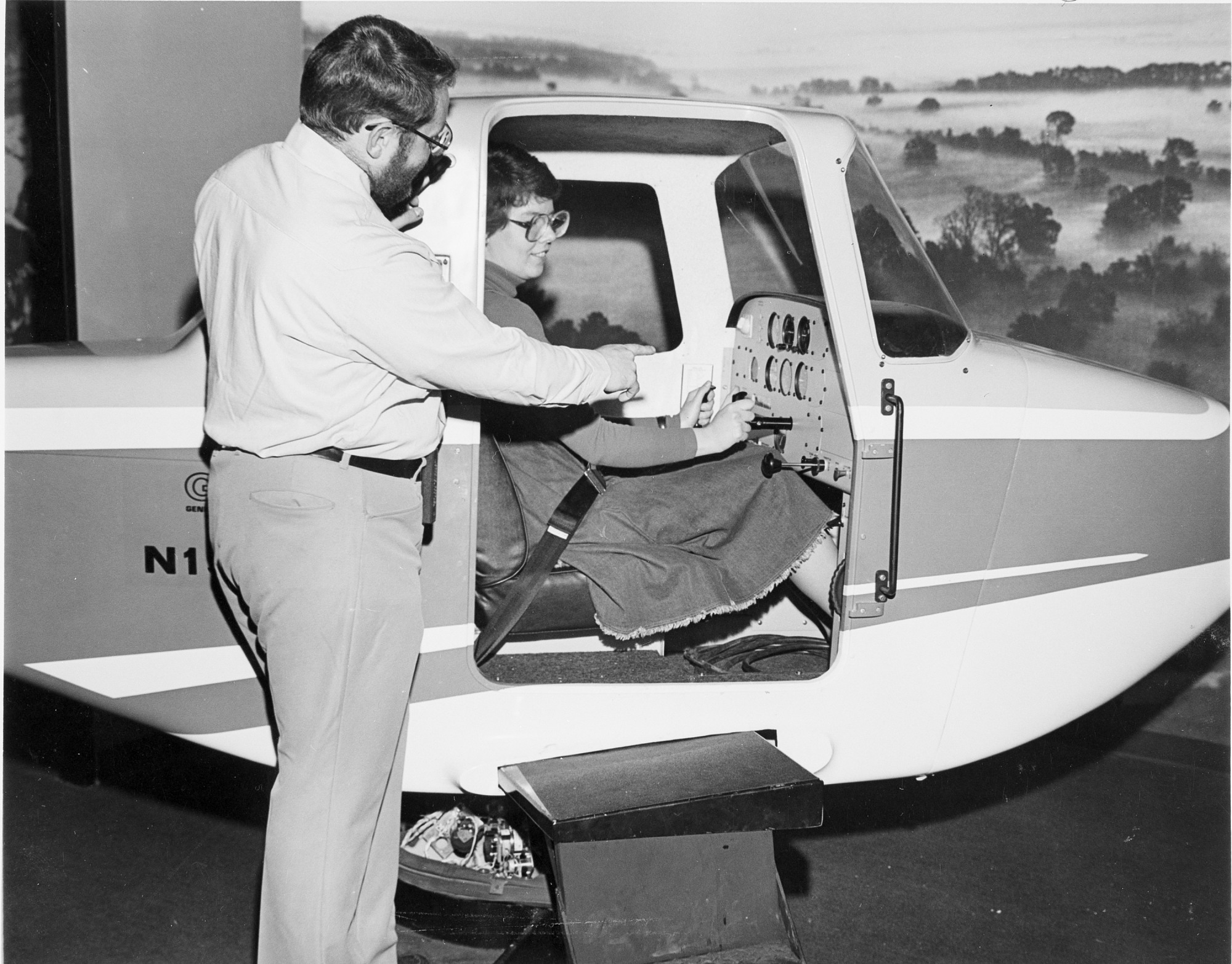 Trying out the National Air and Space Museum flight simulator in the General Aviation Gallery.