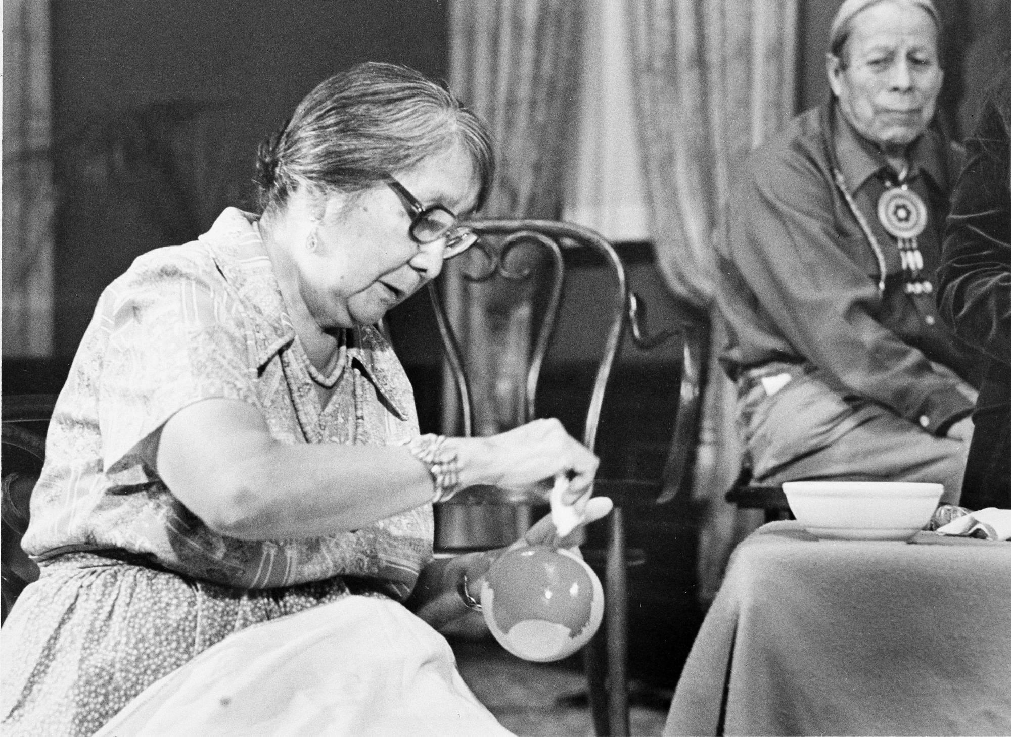 Santana Martinez, whose work was on exhibit at the Renwick Gallery in "Maria Martinez: Five Generations of Potters" (March 31- August 13,1978), polishing a pot.