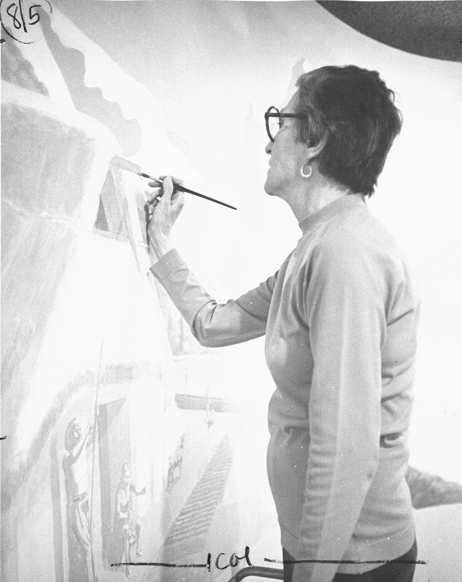 Wilma Riley, an artist for the National Museum of Natural History's Office of Exhibits, at work on a mural showing a Bronze Age Swiss lake village in the museums new exhibit "Western Civilization: Origins and Traditions."