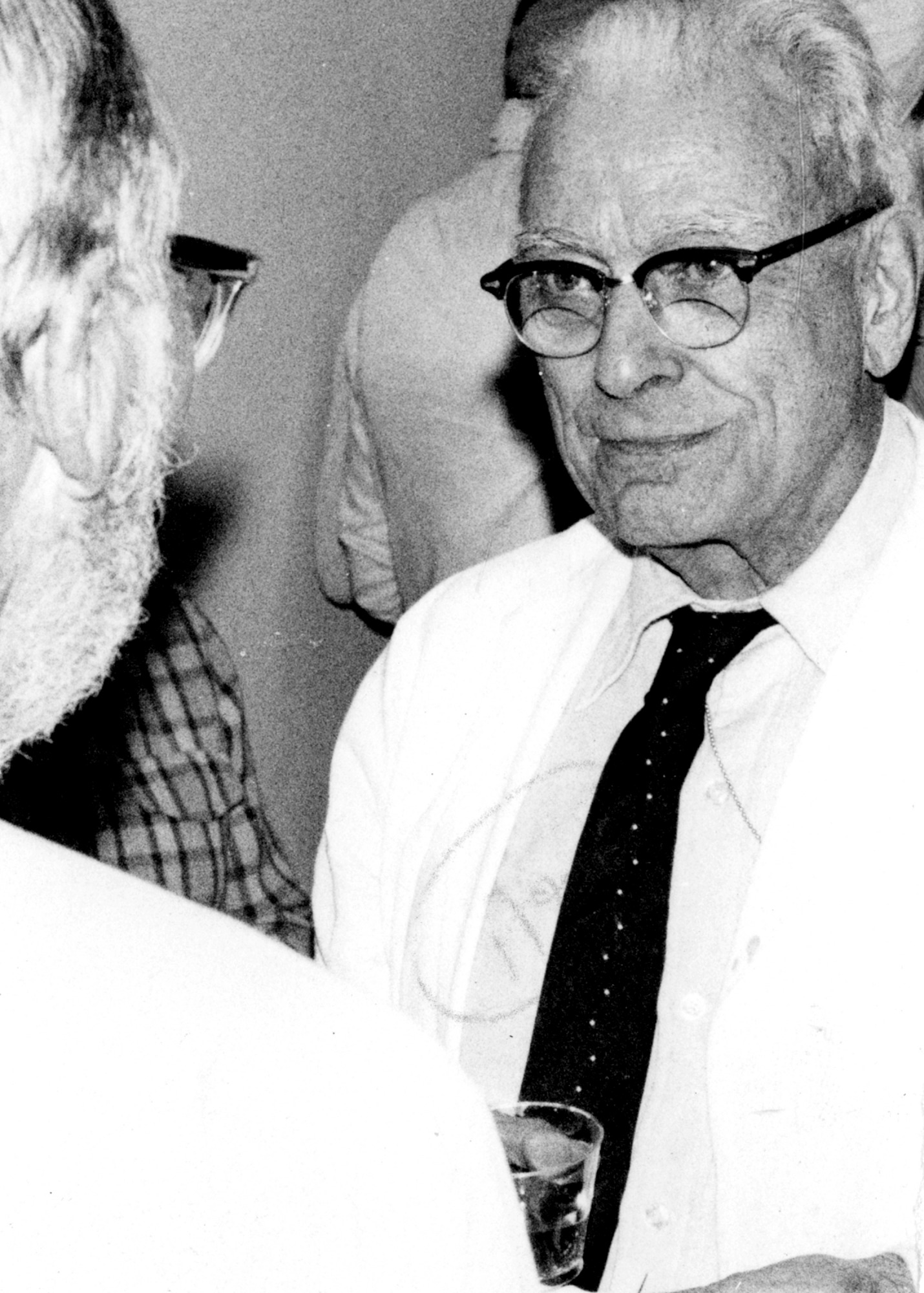 G. Arthur (Gustav Arthur) Cooper (1902-2000), curator of paleobiology, National Museum of Natural History, listens to a guest at his eightieth birthday party at the museum in 1982. Cooper, a paleobiologist specializing in the classification and stratigraphy of Paleozoic brachiopods, was appointed Assistant Curator in the Division of Stratigraphic Paleontology of the United States National Museum (USNM) in 1930. He advanced to Curator of the Division of Invertebrate Paleontology in 1944. He assumed the Head Curatorship of the Department of Geology in 1957, oversaw its split in 1963, and continued as Chairman of the new Department of Paleobiology. In 1967, he was appointed Senior Paleobiologist, to devote his time completely to research, and continued as Paleobiologist Emeritus after his retirement in 1974. Throughout his career he conducted extensive field work in the United States, Canada, and Mexico, adding significantly to the national collections.