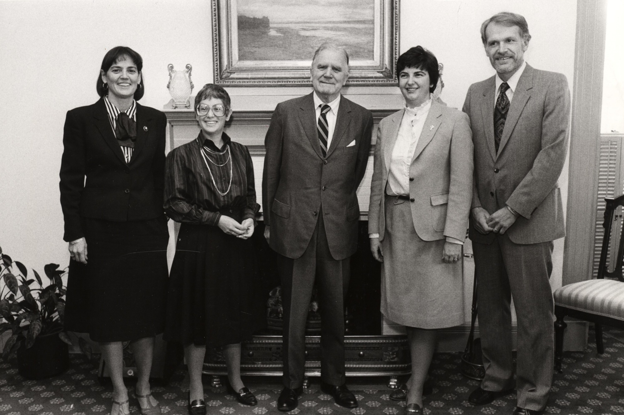 Former regent James E. Webb (center),with (from left) Gretchen Ellsworth, director of the Office of Fellowships and Grants, and fellowship winners Deborah Warner (associate curator and vice chair, Department of Science and Technology, National Museum of American History), Rebecca Webb (Smithsonian Museum Shops) and Jon Yellin (director, Office of Programming and Budget).