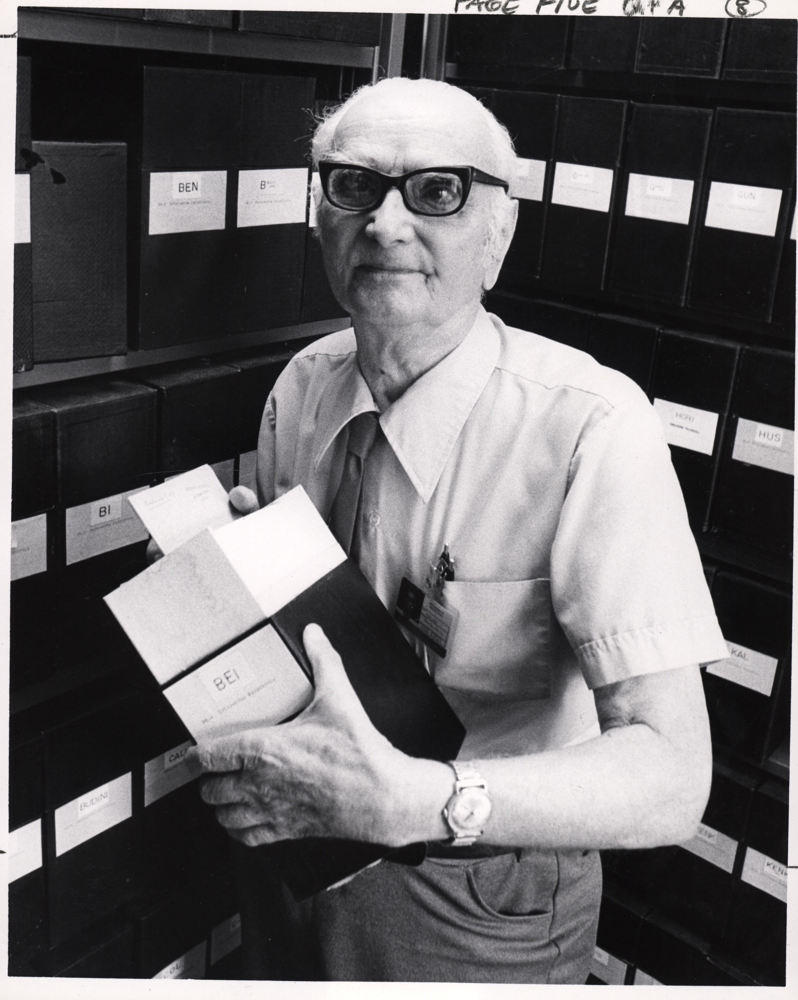 Roman Kenk, a Research Associat,e at the National Museum of Natural History in his exhaustive library of published research on flatworms. Kenk, 84, began a lifetime of research on the ecology, physiology and systematics of freshwater flatworms (Turbellaria) at the University of Graz in Austria. When he retired from the Library of Congress in 1965, he came to the Smithsonian to build a flatworm specimen collection and library.