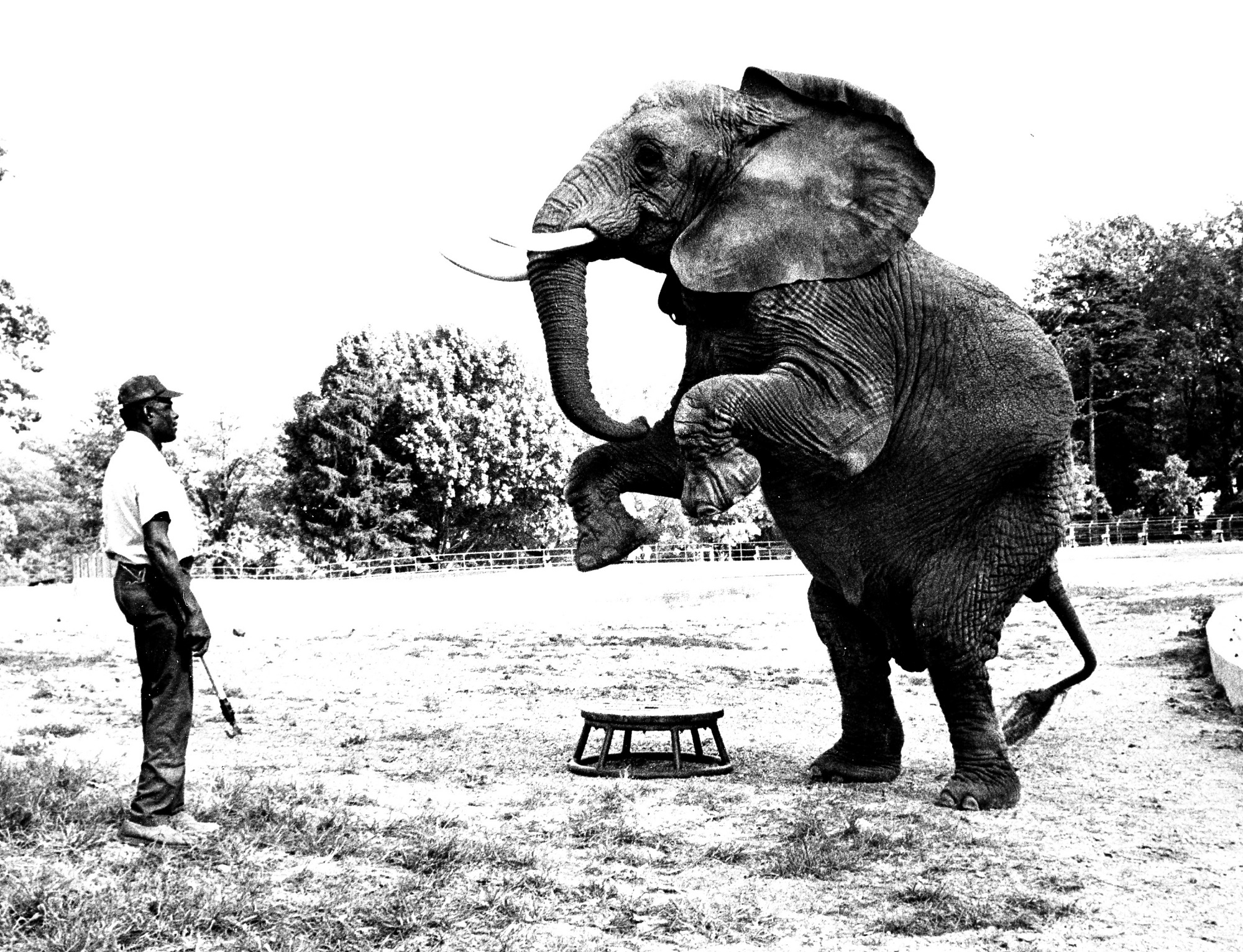 Featured in the Torch, November 1983; The TORCH caption says that the elephant is Ambika, but the back of the photo identifies her as Nancy.