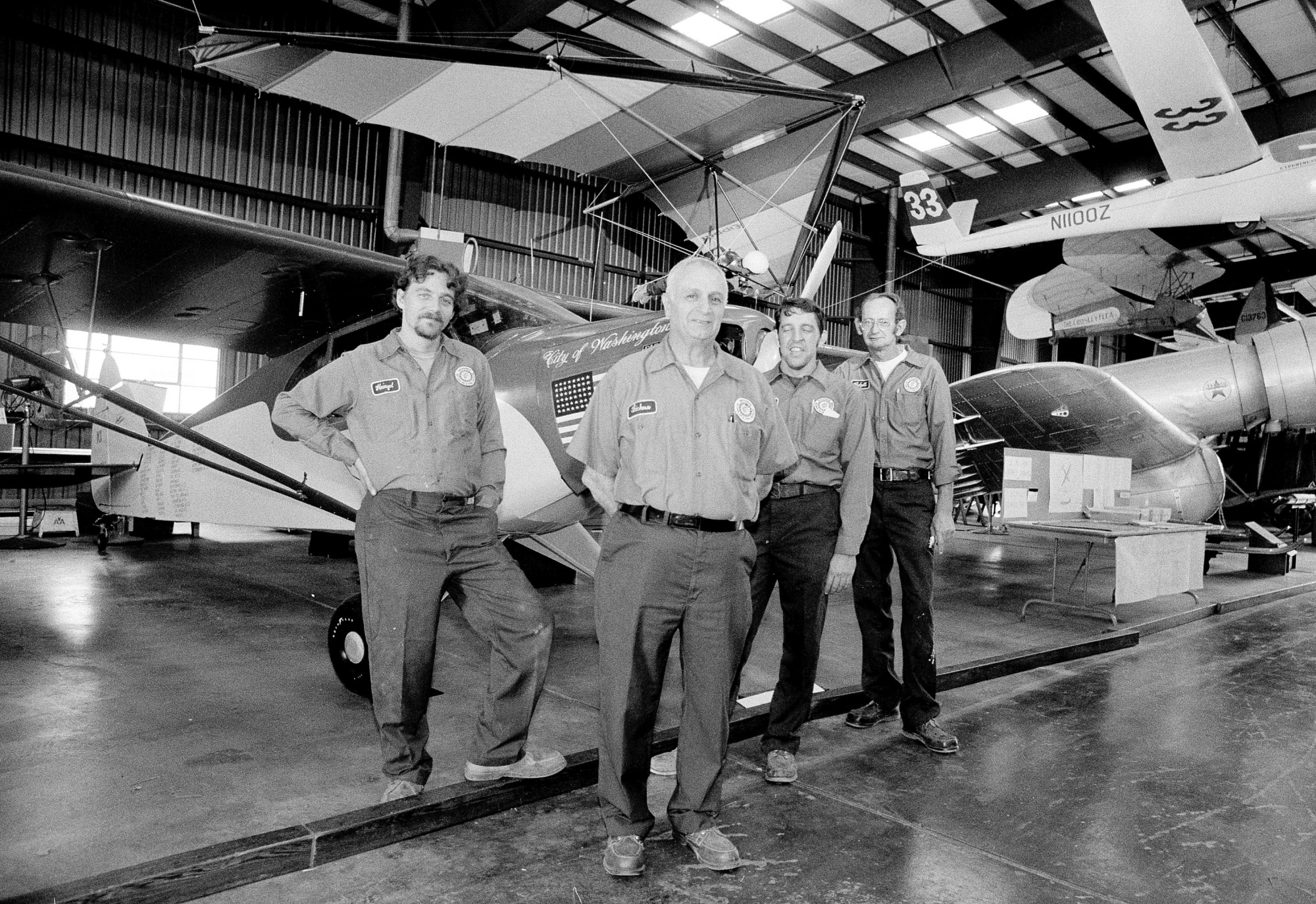 National Air and Space Museum Garber Facility staffers Karl Heinzel, Joe Fichera, Bob Padgett, Rich Horigan standing in front of a plane, 1982.