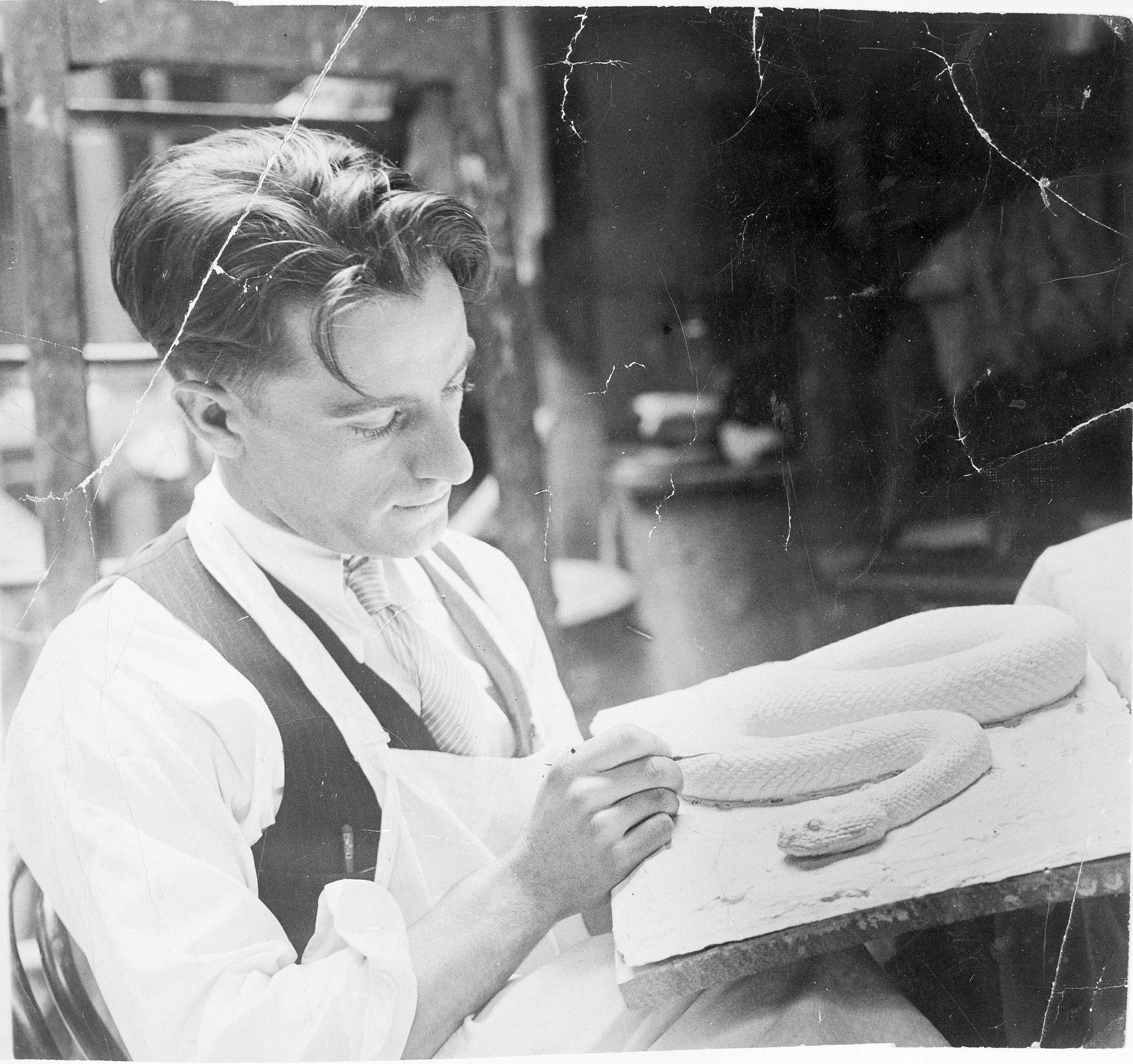 Watson Mondell Perrygo (1906-1984) was a taxidermist, field collector and exhibits specialist at the United States National Museum, now the National Museum of Natural History (NMNH), from 1927 to 1964. He is seen here working on a snake specimen shortly after he joined the staff of the United States National Museum. Perrygo began his career at the USNM in 1927 as a scientific aide in the Division of Mammals and the taxidermy studio. In addition to the taxidermic and other collection-related work, Perrygo was sent on field trips to collect birds, mammals, and snakes unrepresented in the USNM.