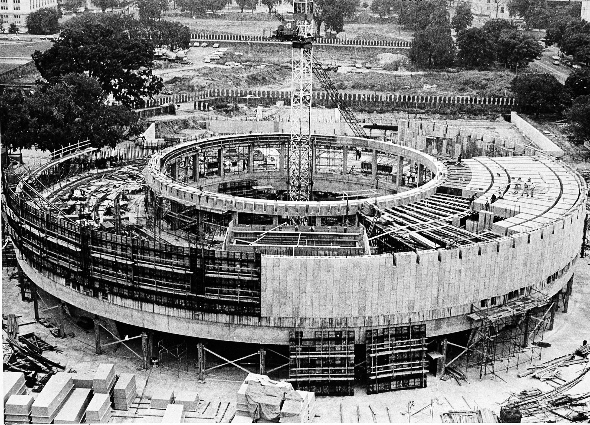 Aerial view of the Hirshhorn Museum and Sculpture Garden under construction, 15 August 1972. The museum building is at about half its height, with the outer wall only half complete. There is a crane in the center of the building, and the sculpture garden can be seen in the background.