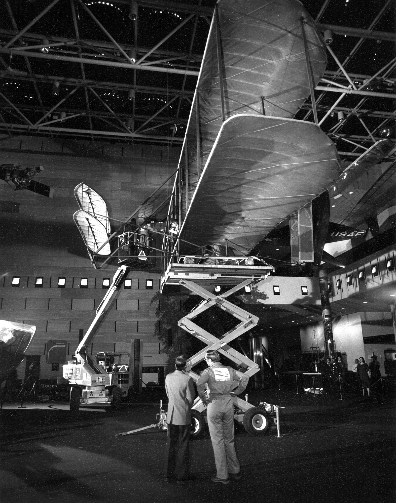 The Wright Brothers' Flyer being removed from the "Milestones of Flight Gallery," National Air and Space Museum. It was moved to another gallery where restoration work was done behind a plexiglass screen so that visitors could witness the event.